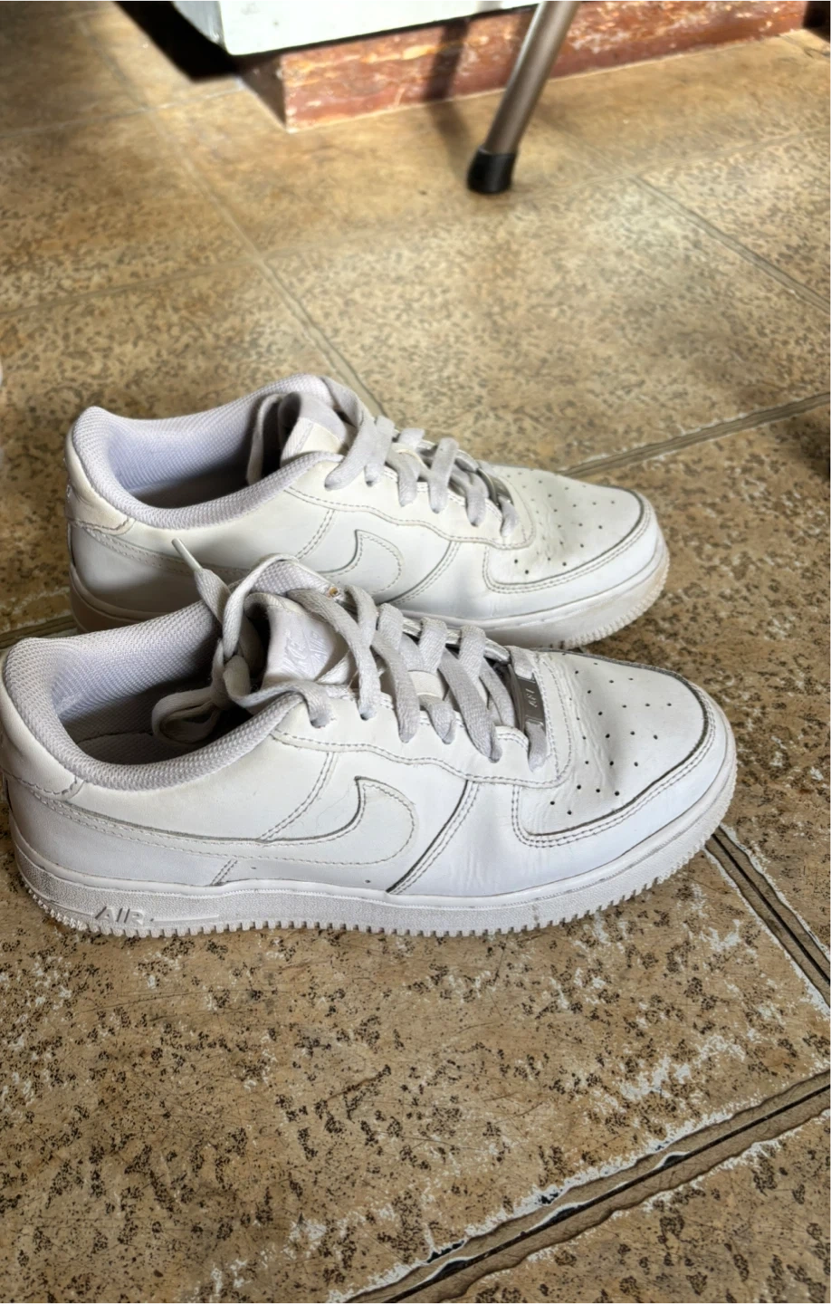 Classic white Nike Air Force 1 '07 sneakers. Leather upper with a rubber sole. UK size 5.5, US size 6Y, EU size 38.5, CM size 24.