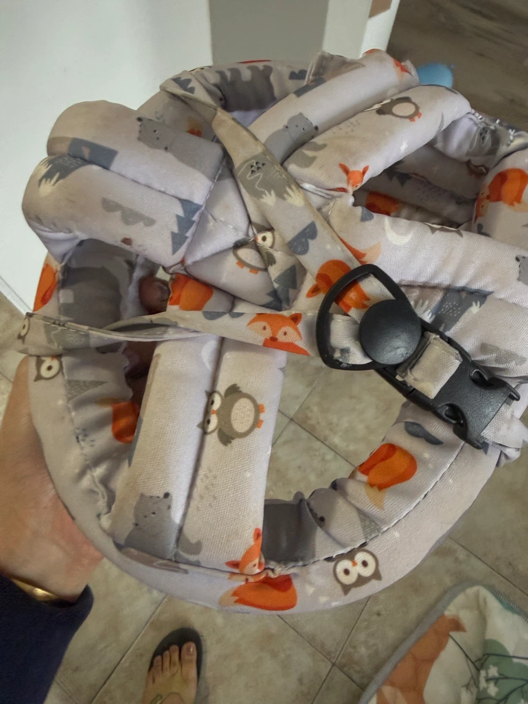 This baby head protection helmet features a cute grey pattern with foxes, owls, and bears. It's designed to offer cushioning and support for little ones learning to walk. Padded interior for comfort.