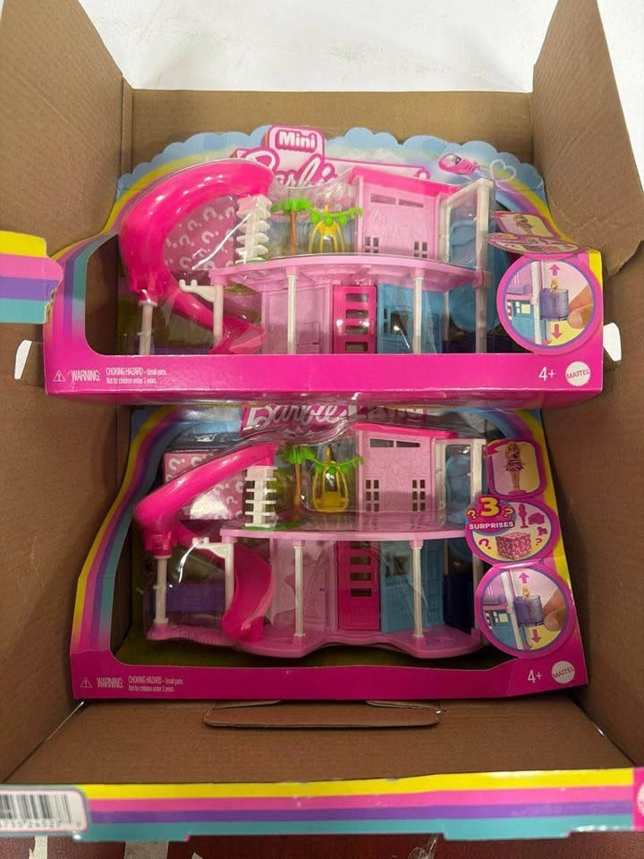 Includes a Mini Dreamhouse with a surprise 1.5-inch Barbie doll, furniture, and accessories. Features an elevator and a pool.