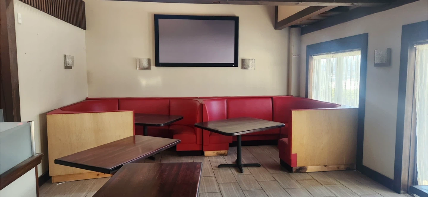 Red Booth Seating with Wood Accents