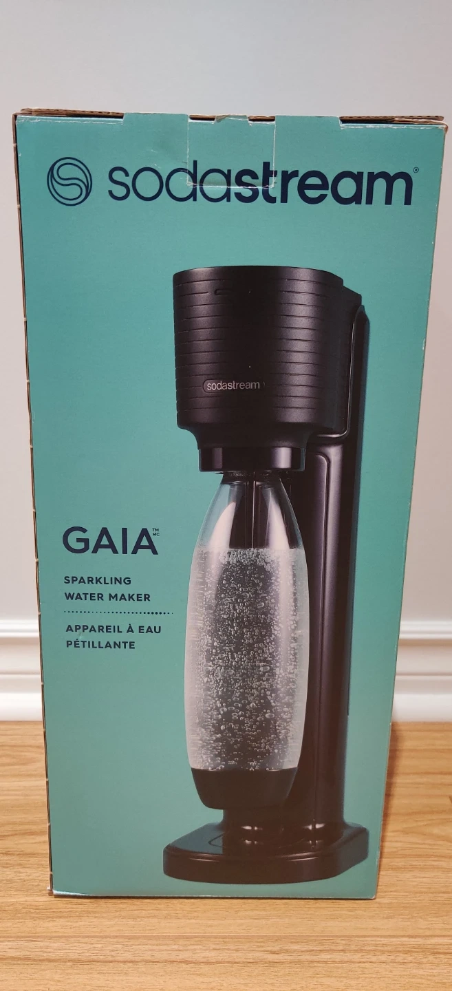 This is a SodaStream GAIA sparkling water maker in black. It comes with a CO2 cylinder and a 1L BPA-free bottle. One SodaStream can save up to thousands of single-use plastic bottles. This appliance is for making carbonated water at home.