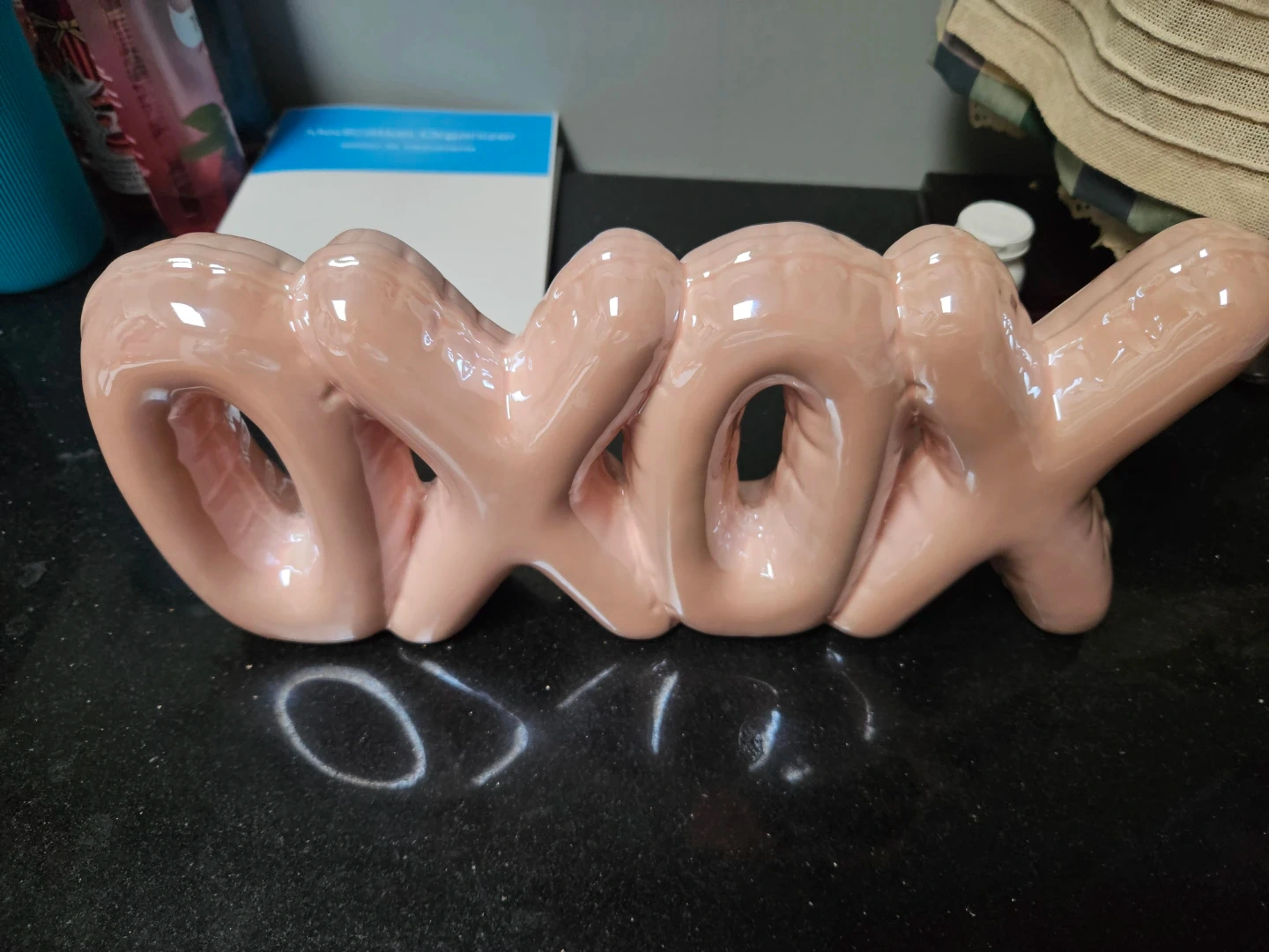 This is a shiny, blush-pink ceramic sculpture that spells out "XOXO". It's a lovely piece for adding a touch of warmth to any shelf or tabletop. The material is ceramic.
