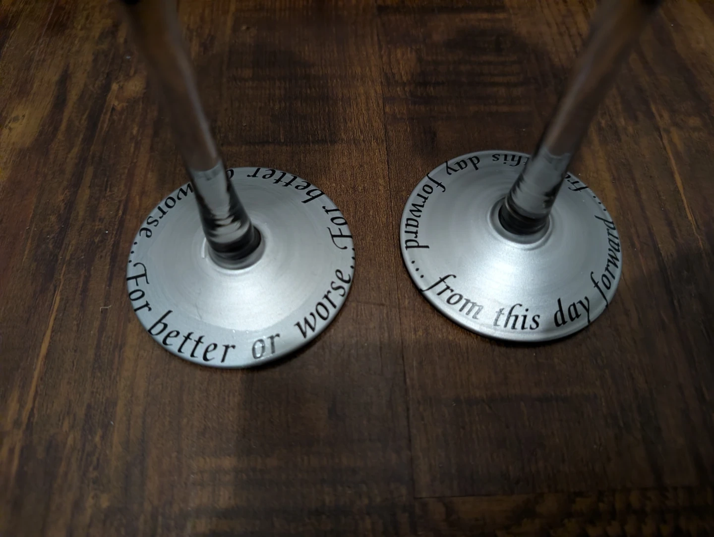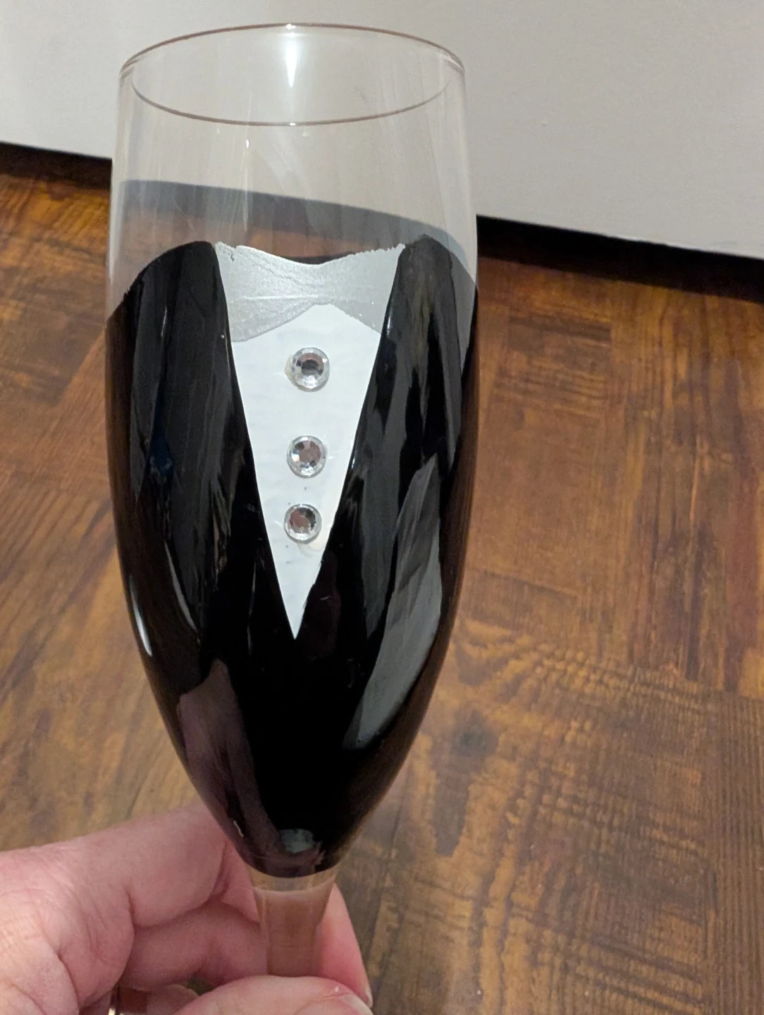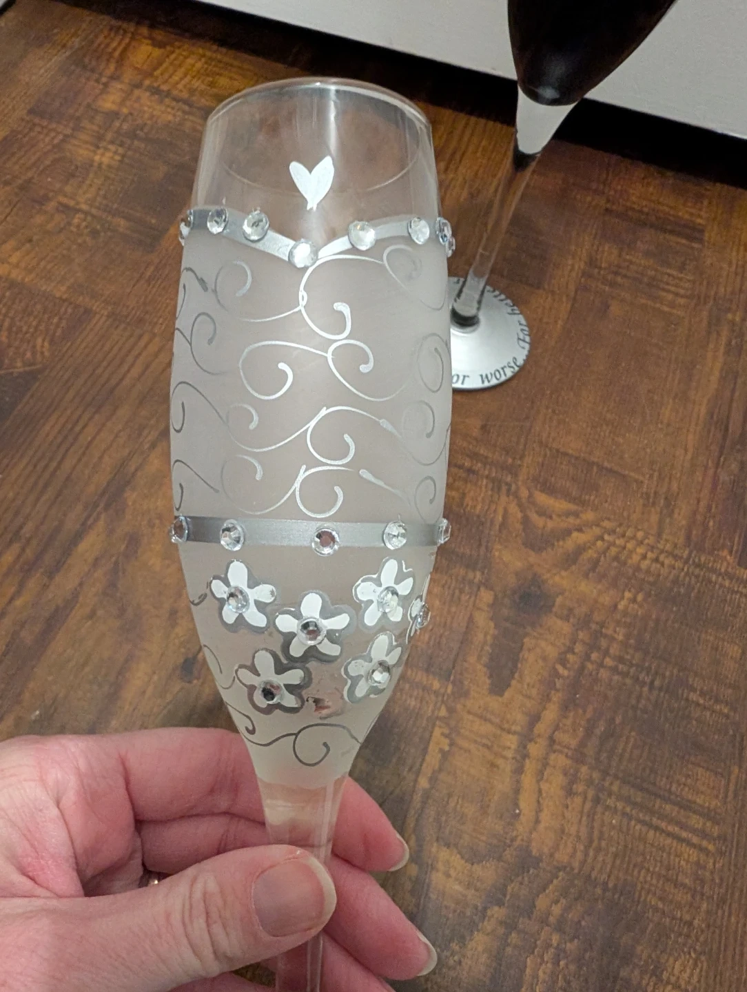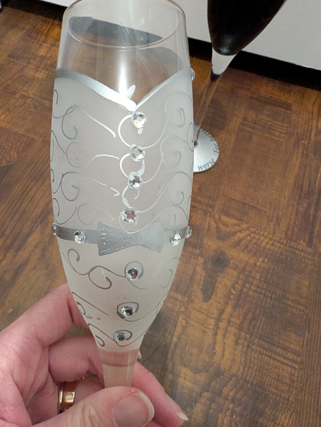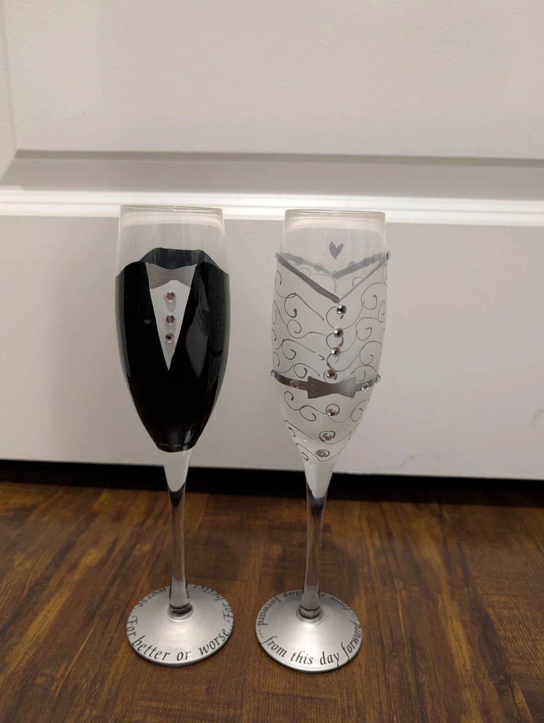 This charming set includes two champagne flutes, one designed with a black tuxedo and the other with a white wedding dress pattern, adorned with rhinestones. The bases feature sentiments: "For better or worse" and "...from this day forward". Perfect for wedding celebrations!