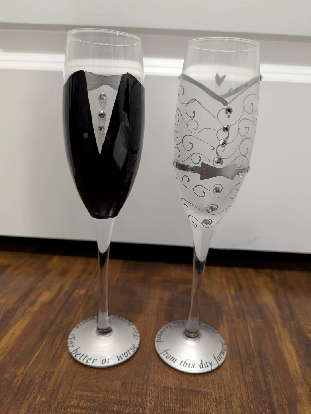 This charming set includes two champagne flutes, one designed with a black tuxedo and the other with a white wedding dress pattern, adorned with rhinestones. The bases feature sentiments: "For better or worse" and "...from this day forward". Perfect for wedding celebrations!
