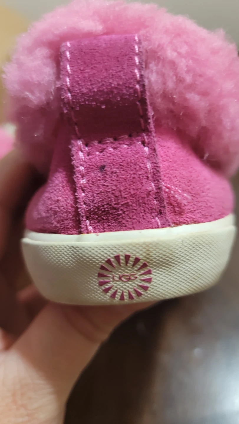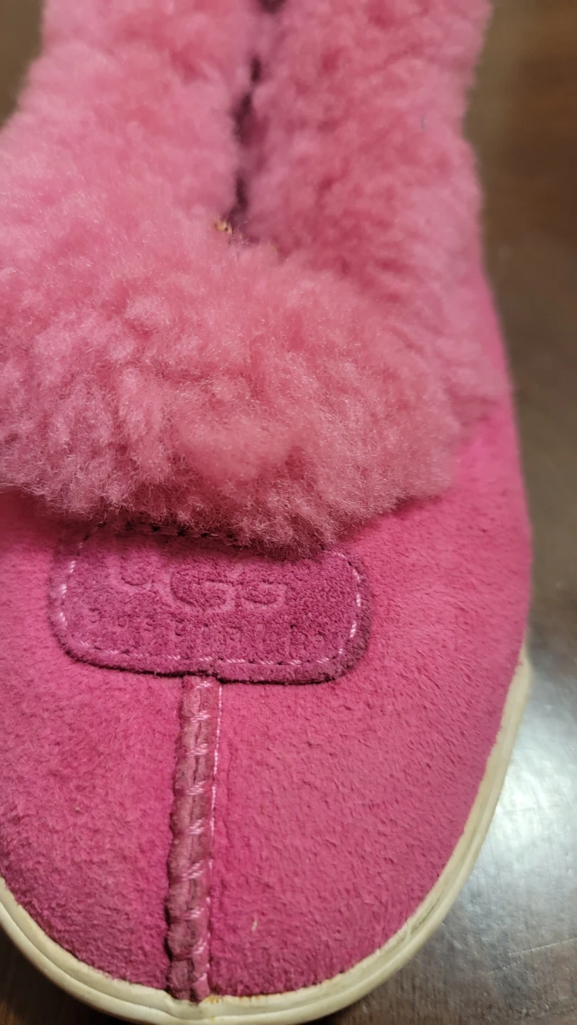Cozy pink suede slippers from UGG Australia. Feature a fluffy sheepskin lining and trim for extra warmth. These are slip-on style shoes. Perfect for keeping your feet warm during colder months!