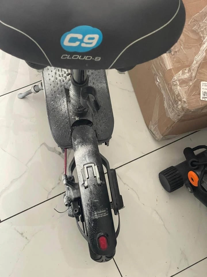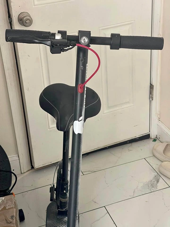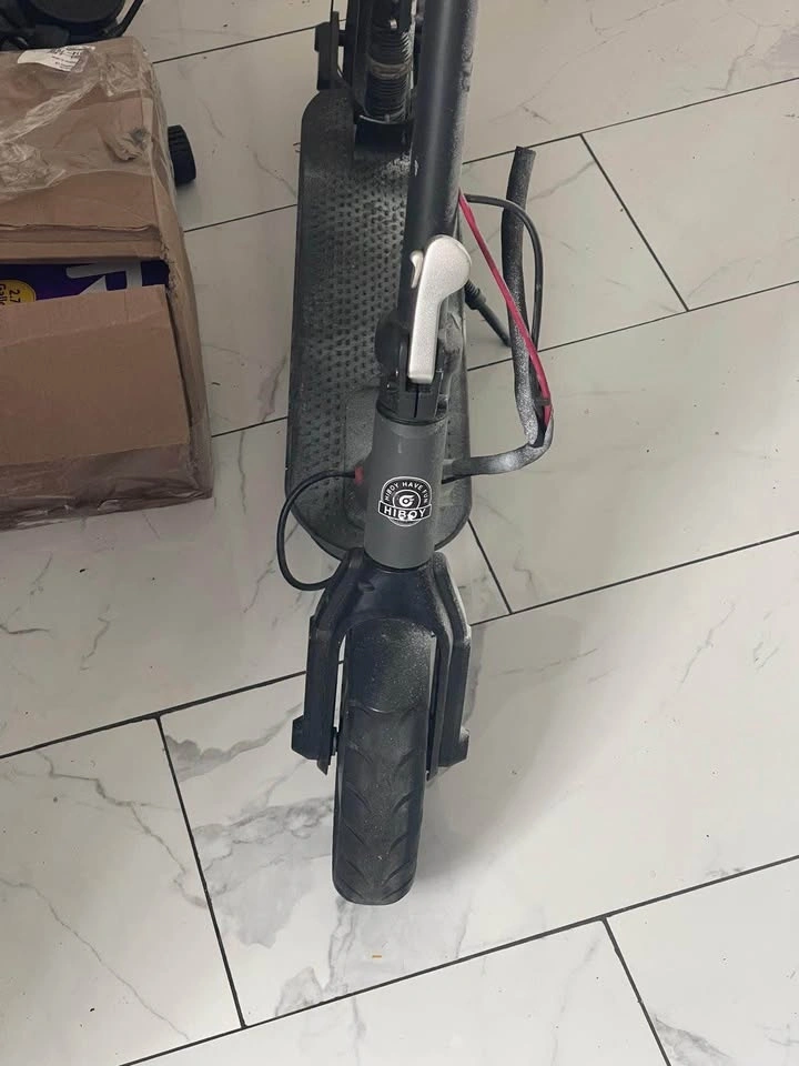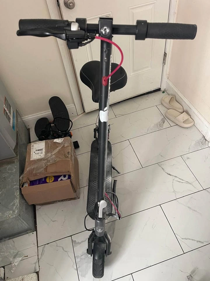This is an electric scooter featuring a seat and a sturdy frame. It appears to have a foldable design and is equipped with a rear wheel drive. The scooter shows signs of use, with some wear visible on the deck and tires. It’s perfectly fine I can’t find the charger.. give me a offer