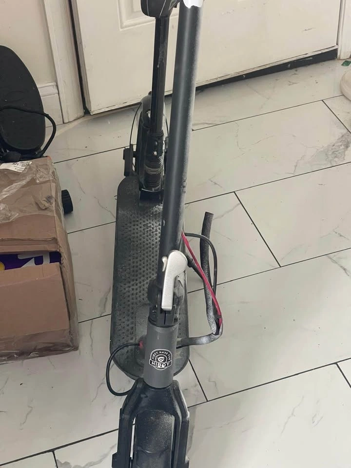 This is an electric scooter featuring a seat and a sturdy frame. It appears to have a foldable design and is equipped with a rear wheel drive. The scooter shows signs of use, with some wear visible on the deck and tires. It’s perfectly fine I can’t find the charger.. give me a offer