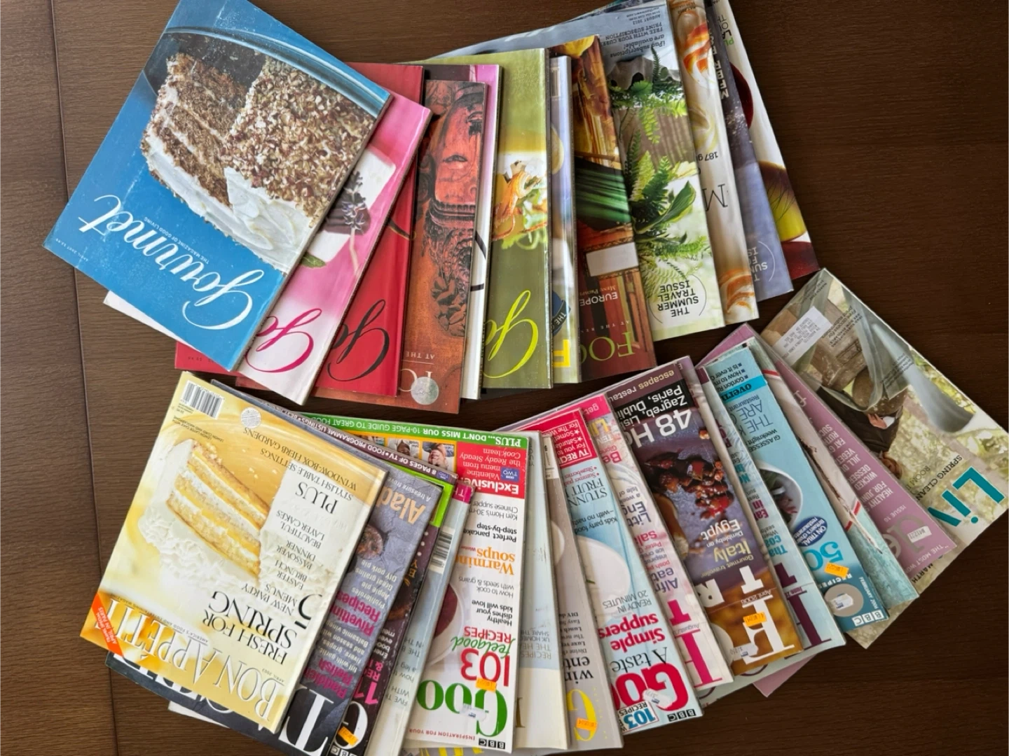 A collection of various food and lifestyle magazines, including titles like Gourmet, Bon Appetit, and BBC Good Food. Great for recipe inspiration or a cozy read!