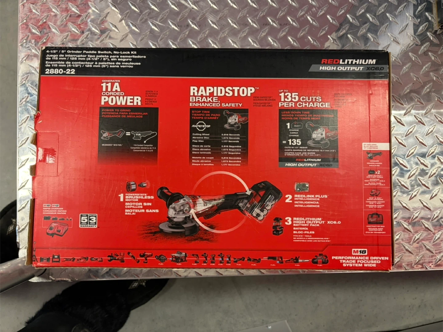 Selling a Milwaukee M18 FUEL cordless angle grinder kit. It features Rapidstop brake and enhanced safety. It comes with two 6.0 Ah RedLithium High Output XC6.0 batteries and a charger. This grinder generates 11A corded power and delivers up to 135 cuts per charge.