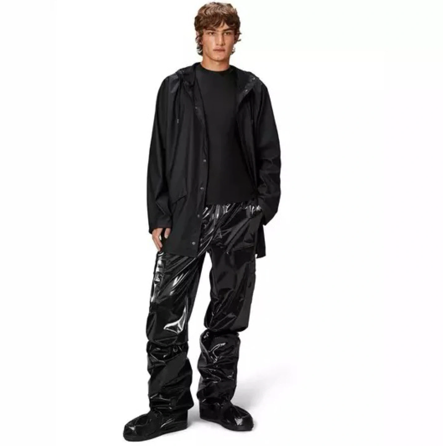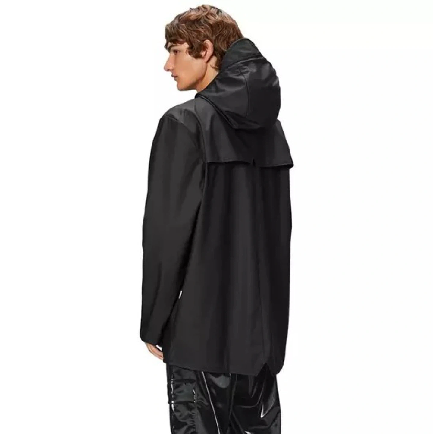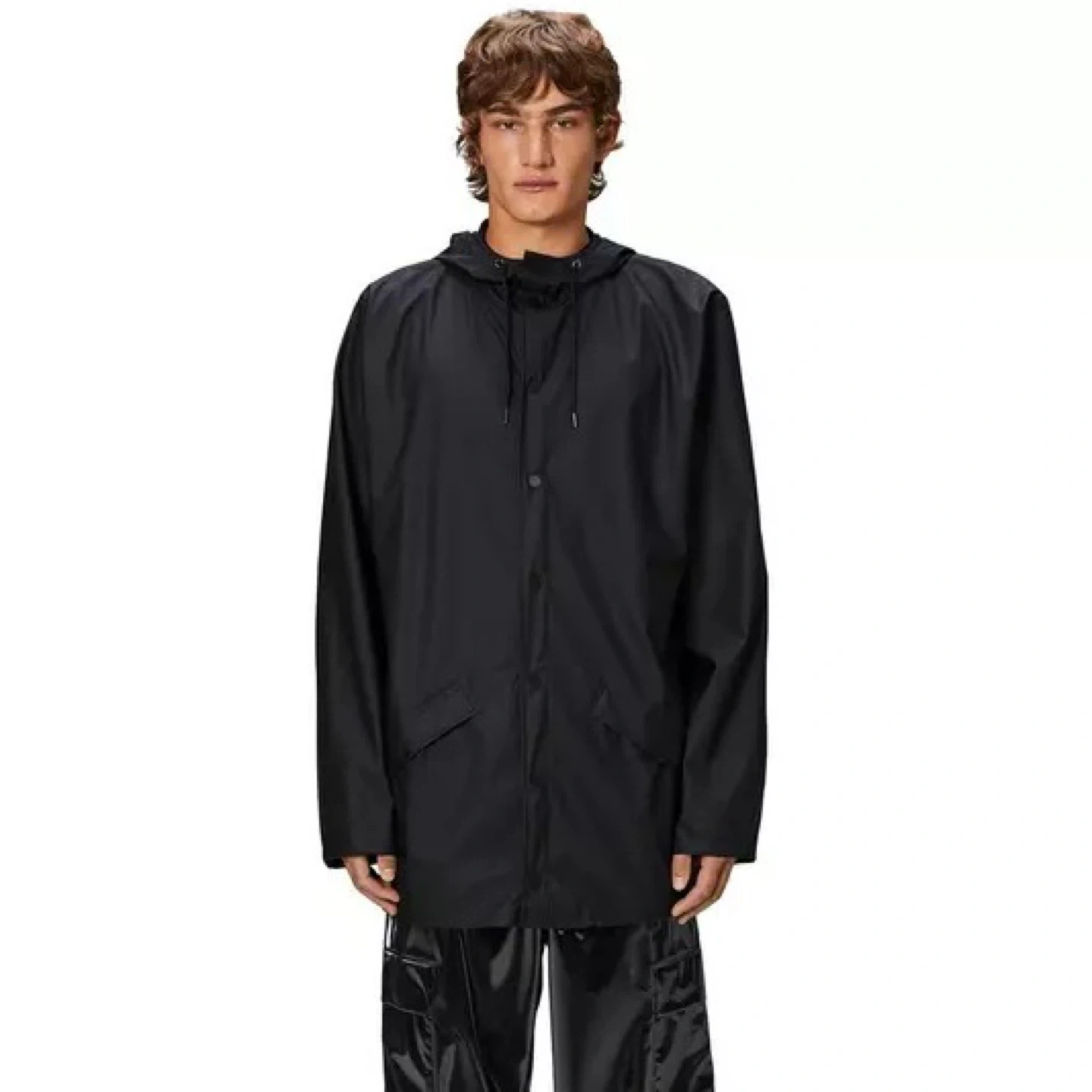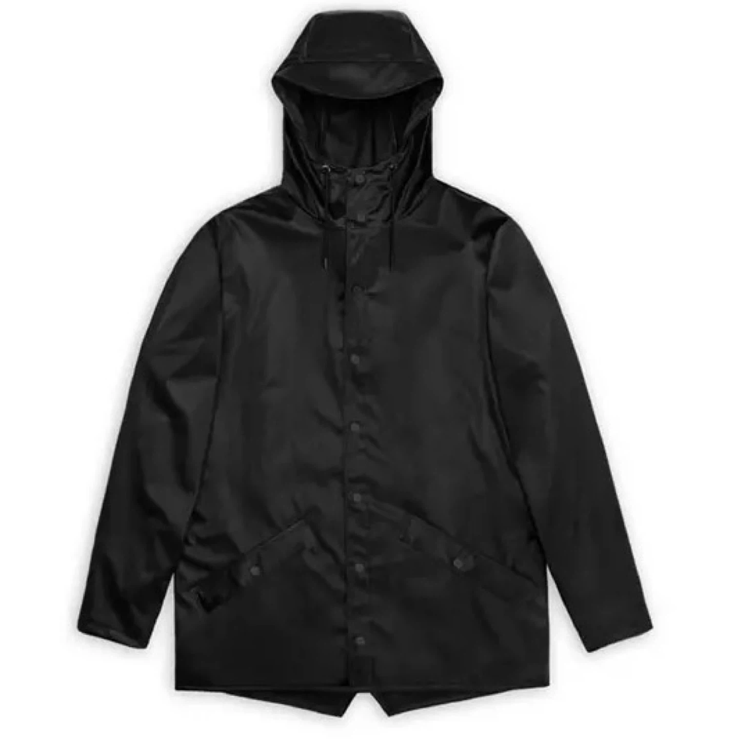 Cut from Rains' proprietary waterproof and windproof fabric, this contemporary rain jacket combines high functionality with a sleek, minimal design. It features ultrasonically welded seams, adjustable cuffs and a fishtail hem, enhanced by practical details like double-welded pockets and snap-button closures throughout for a refined look. Lightweight and elegantly draped, it protects from downpours in comfort and style, complete with under-arm eyelets and a ventilated back yoke for added breathability.