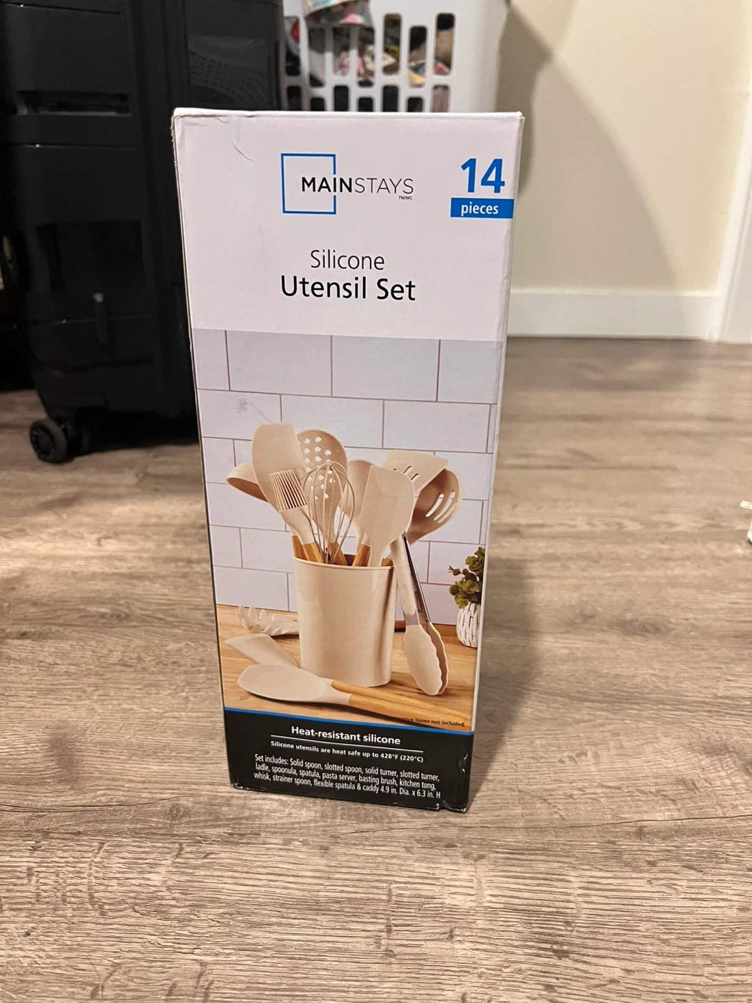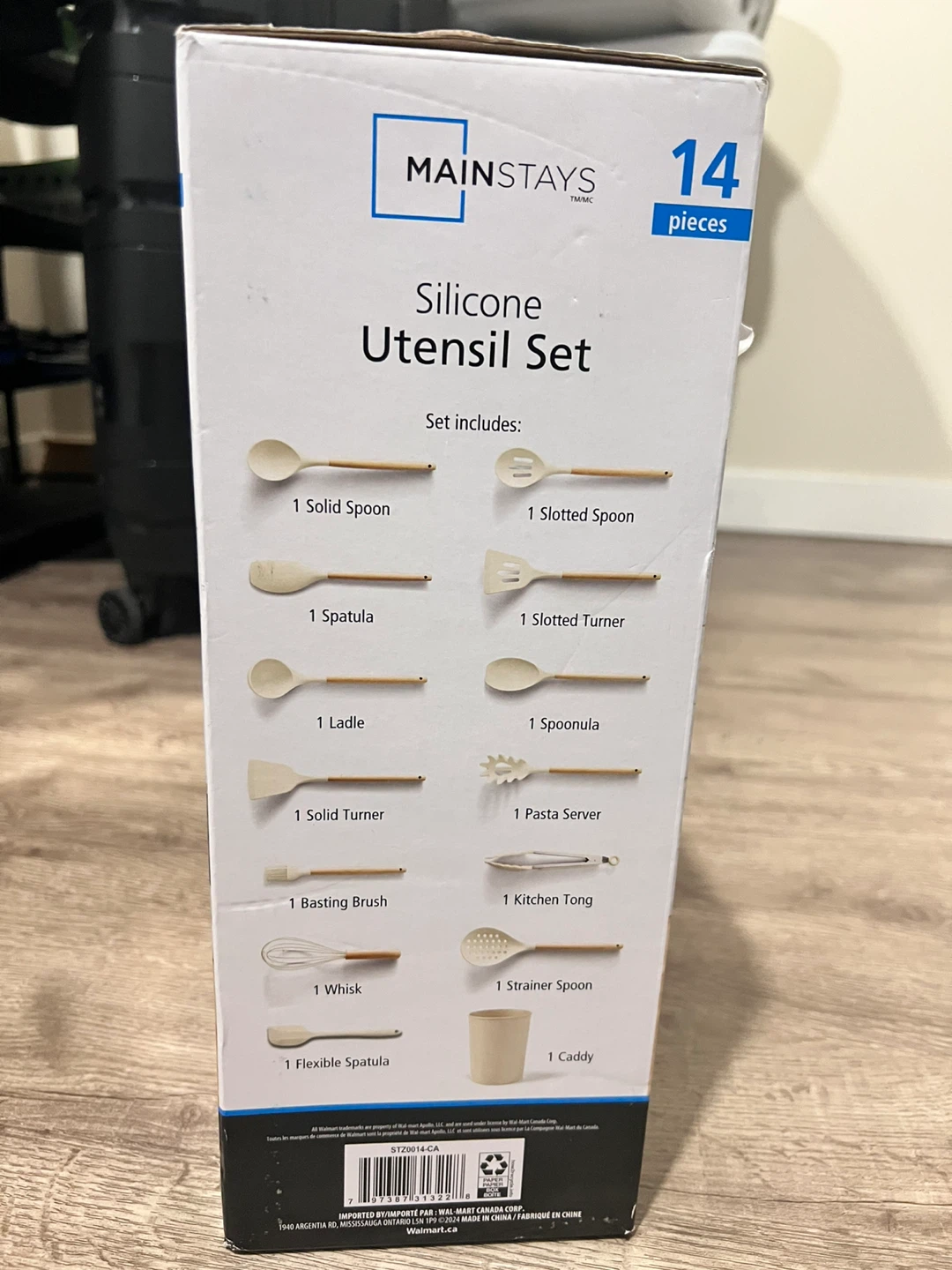 This is a 14-piece silicone utensil set. It includes a solid spoon, slotted spoon, spatula, slotted turner, ladle, spoonula, solid turner, pasta server, basting brush, kitchen tong, whisk, strainer spoon, and a caddy. These utensils are heat-resistant up to 428°F.
