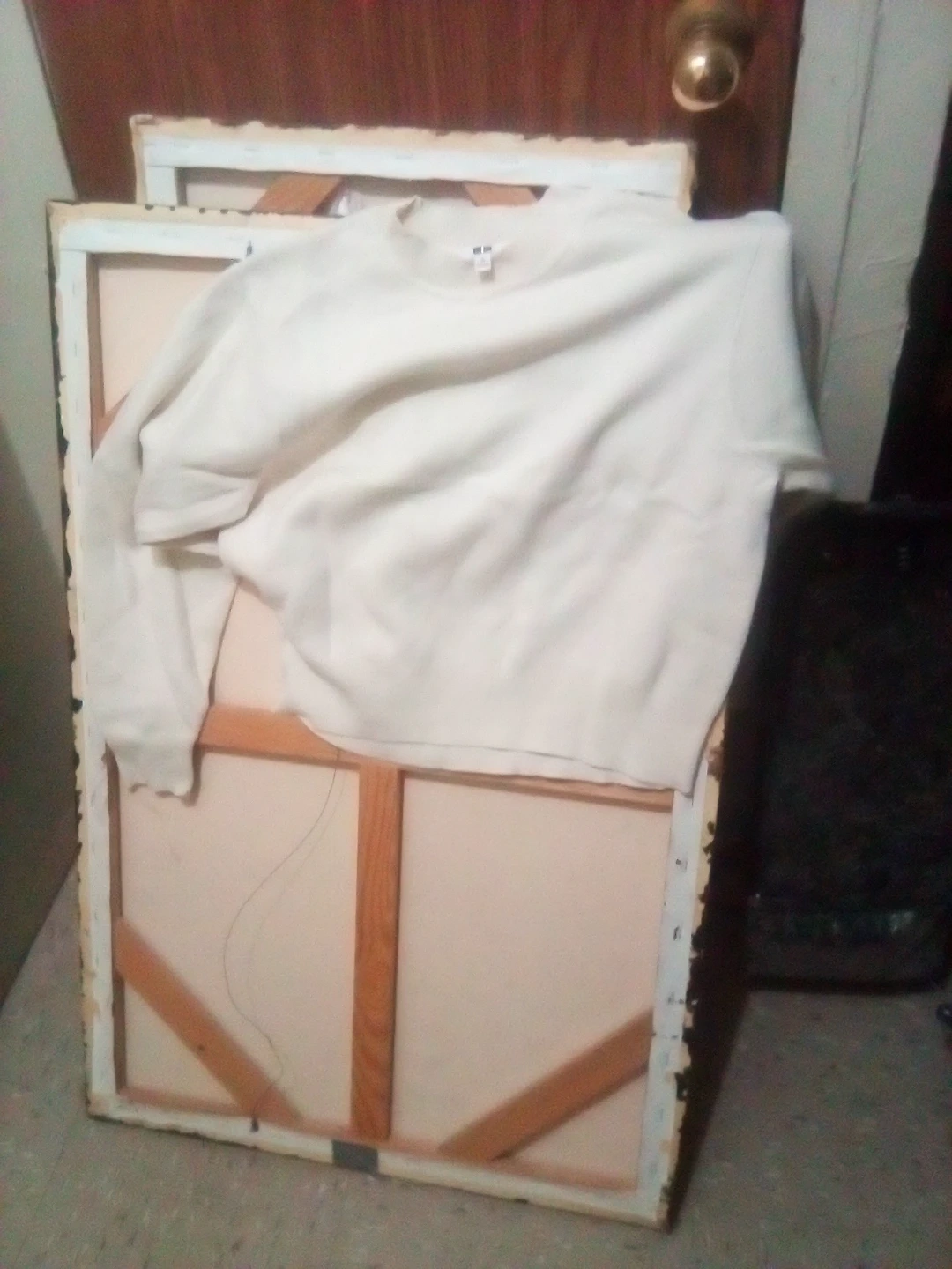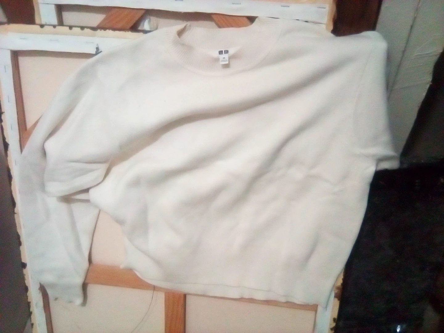 Cream colored Uniqlo crewneck sweater. This long-sleeve top is made from a soft knit material. It's a versatile piece for layering or wearing on its own.