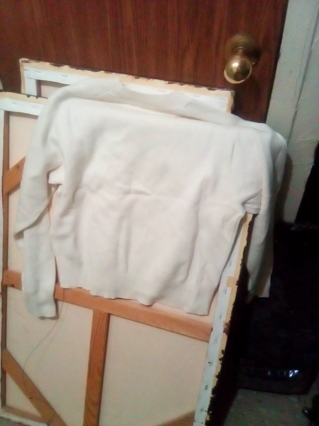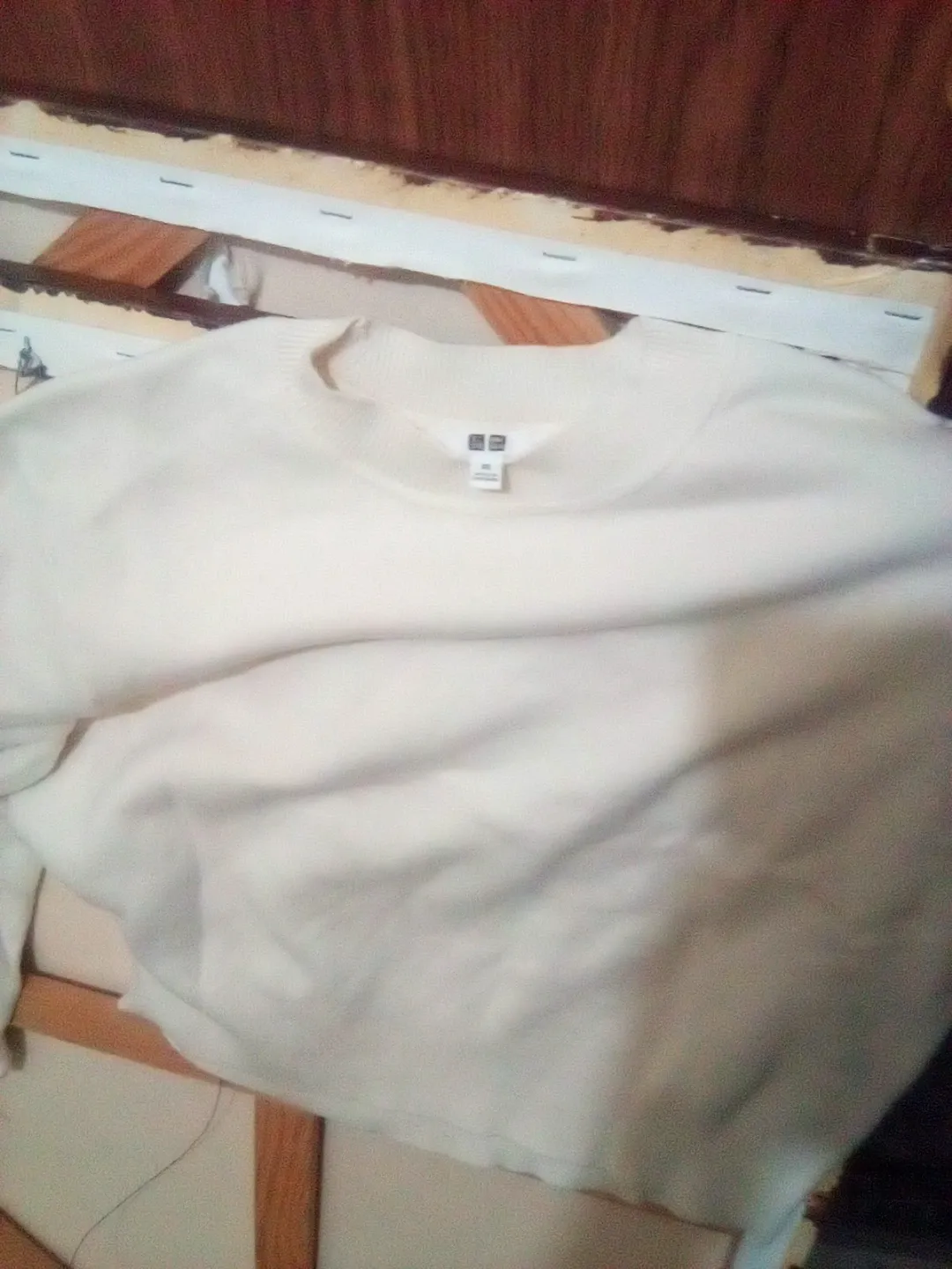 Cream colored Uniqlo crewneck sweater. This long-sleeve top is made from a soft knit material. It's a versatile piece for layering or wearing on its own.