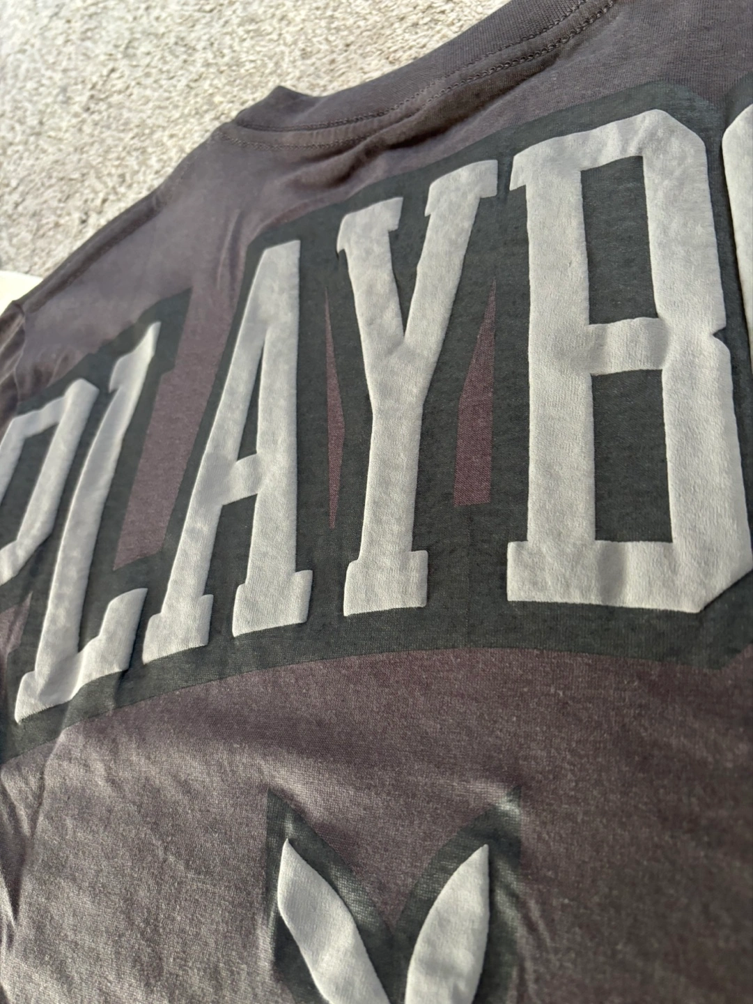 Pair of Playboy t-shirts. One white, one dark grey. Both size small. Features an arch Playboy logo and bunny head. 60% cotton, 40% polyester. Words on the back of the shirt are puffed. $10 each