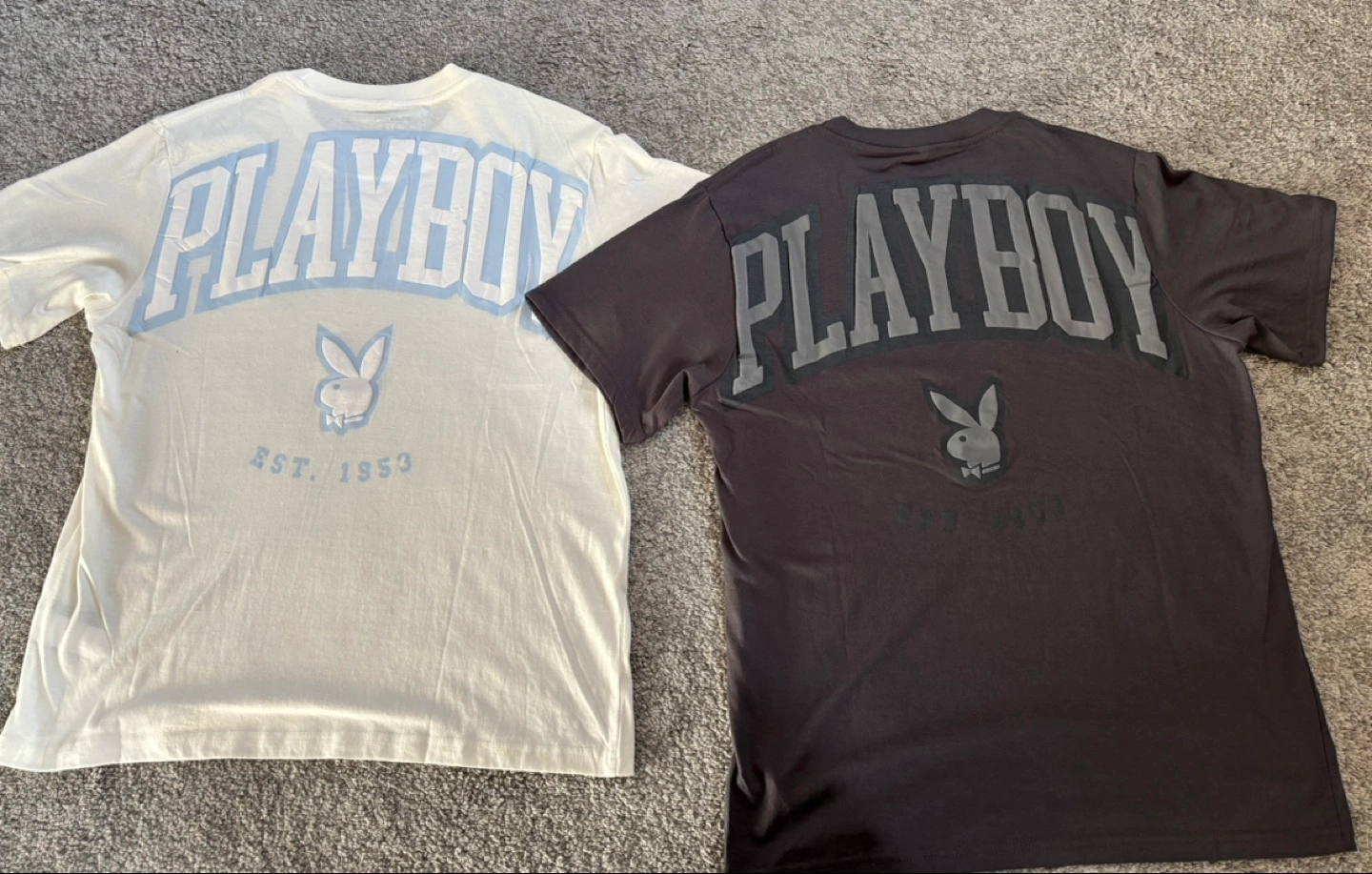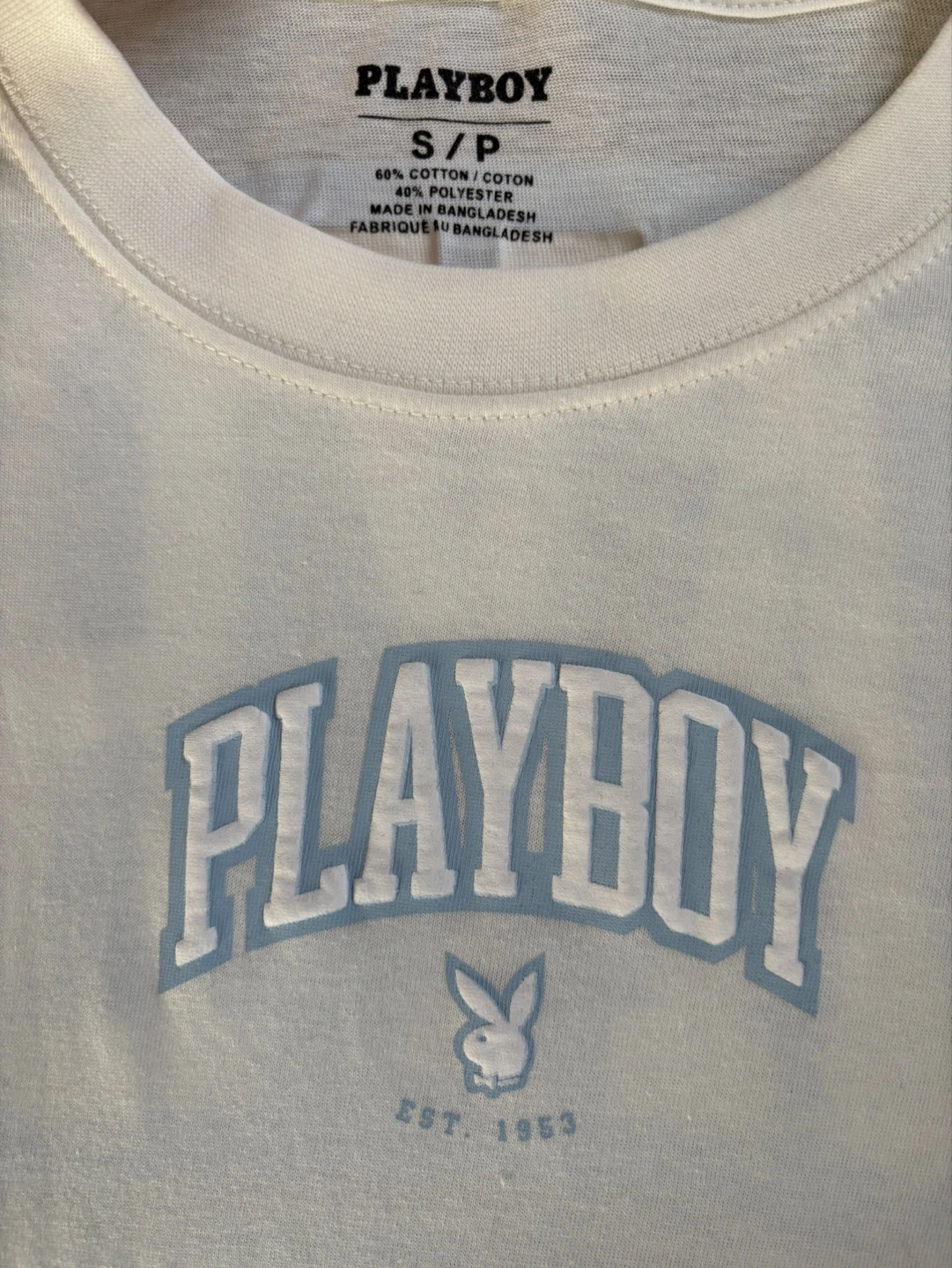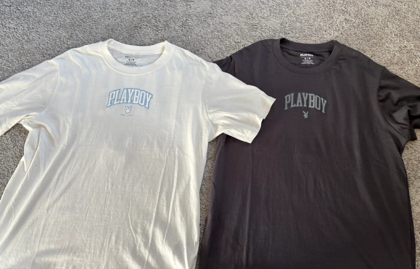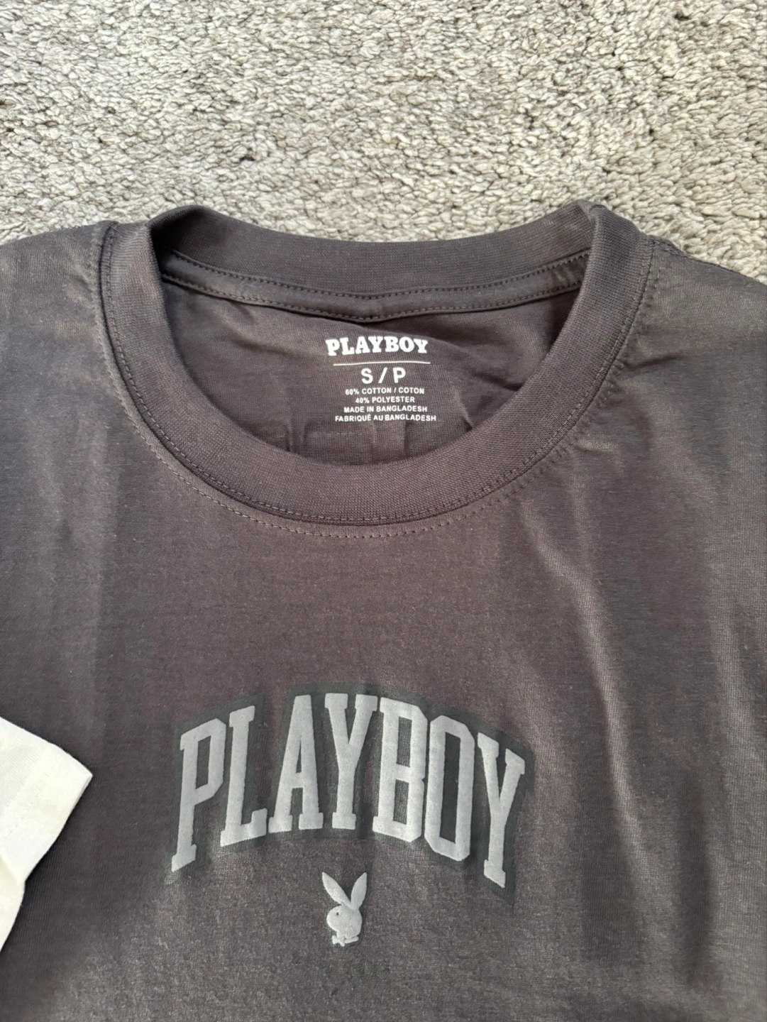 Pair of Playboy t-shirts. One white, one dark grey. Both size small. Features an arch Playboy logo and bunny head. 60% cotton, 40% polyester. Words on the back of the shirt are puffed. $10 each