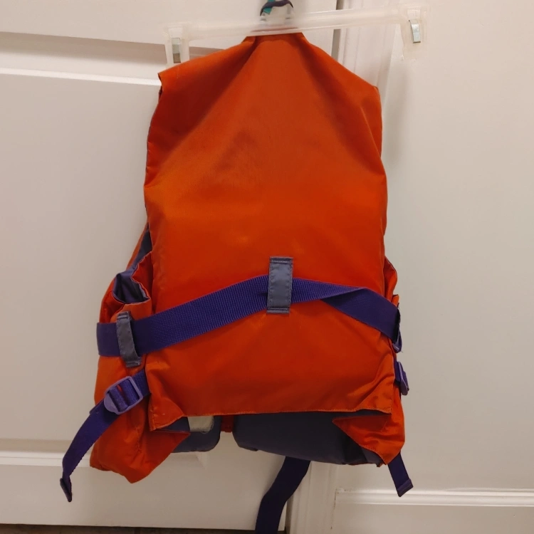 Orange Mustang Survival life jacket with purple accents. It features adjustable straps and a zipper closure. Built for safety on the water!
