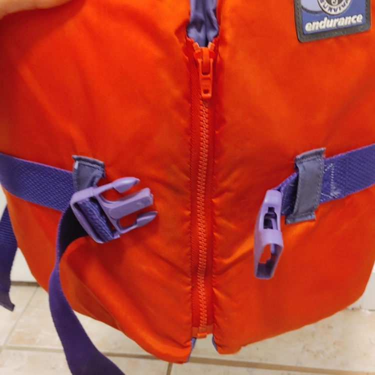 Orange Mustang Survival life jacket with purple accents. It features adjustable straps and a zipper closure. Built for safety on the water!