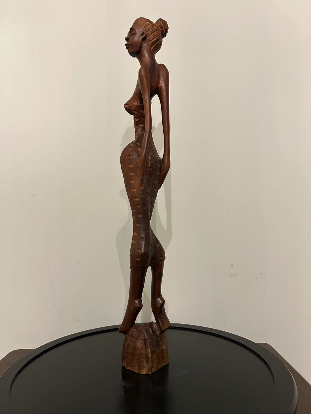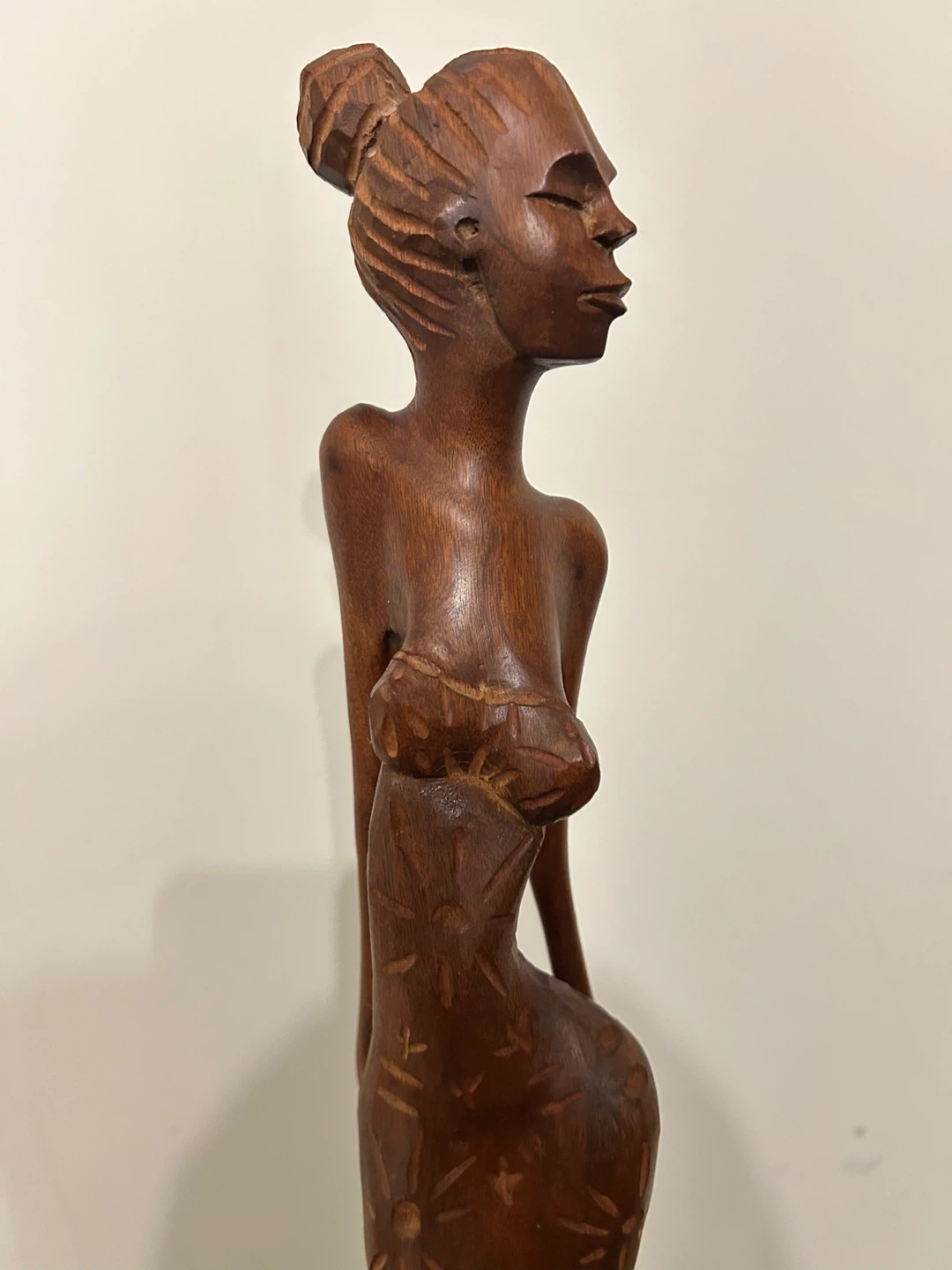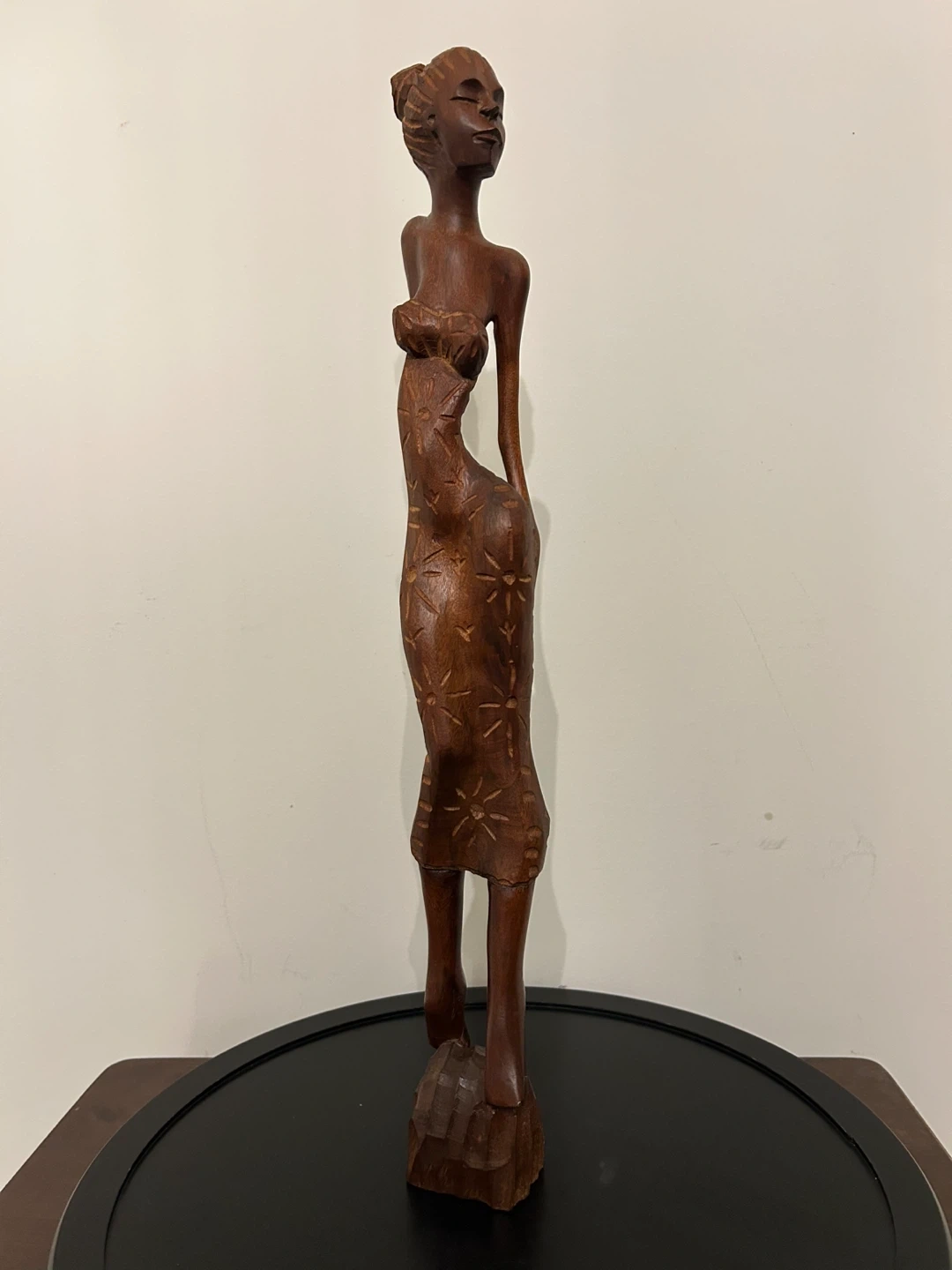 A striking piece of authentic Cuban folk art, this vintage hand-carved wooden sculpture features an elegant, elongated female figure with refined proportions and beautiful craftsmanship. Carved from solid dark wood, the statue has a rich natural tone and smooth polished finish that enhances its sculptural presence. The figure wears a stylized high-bun hairstyle and a flowing dress adorned with etched sun and floral motifs, adding depth, texture, and cultural character. The clean vertical form and decorative carving make it a wonderful statement piece for collectors of Caribbean art, Mid-Century inspired interiors, or globally curated spaces. Excellent vintage condition with light, natural age wear consistent with handmade wooden art. • Pick up: Seton area, Calgary. • Shipping: around Canada (Canada Post with tracking). • Payment: e-transfers and cash. • See also my other lots. Open to your questions and suggestions. If necessary, I provide additional photos. • These are not new things, so please look carefully at the photos and videos. Sizes are submitted on request and also using a tape measure in the photo. Measurements can be seen in the photos.
