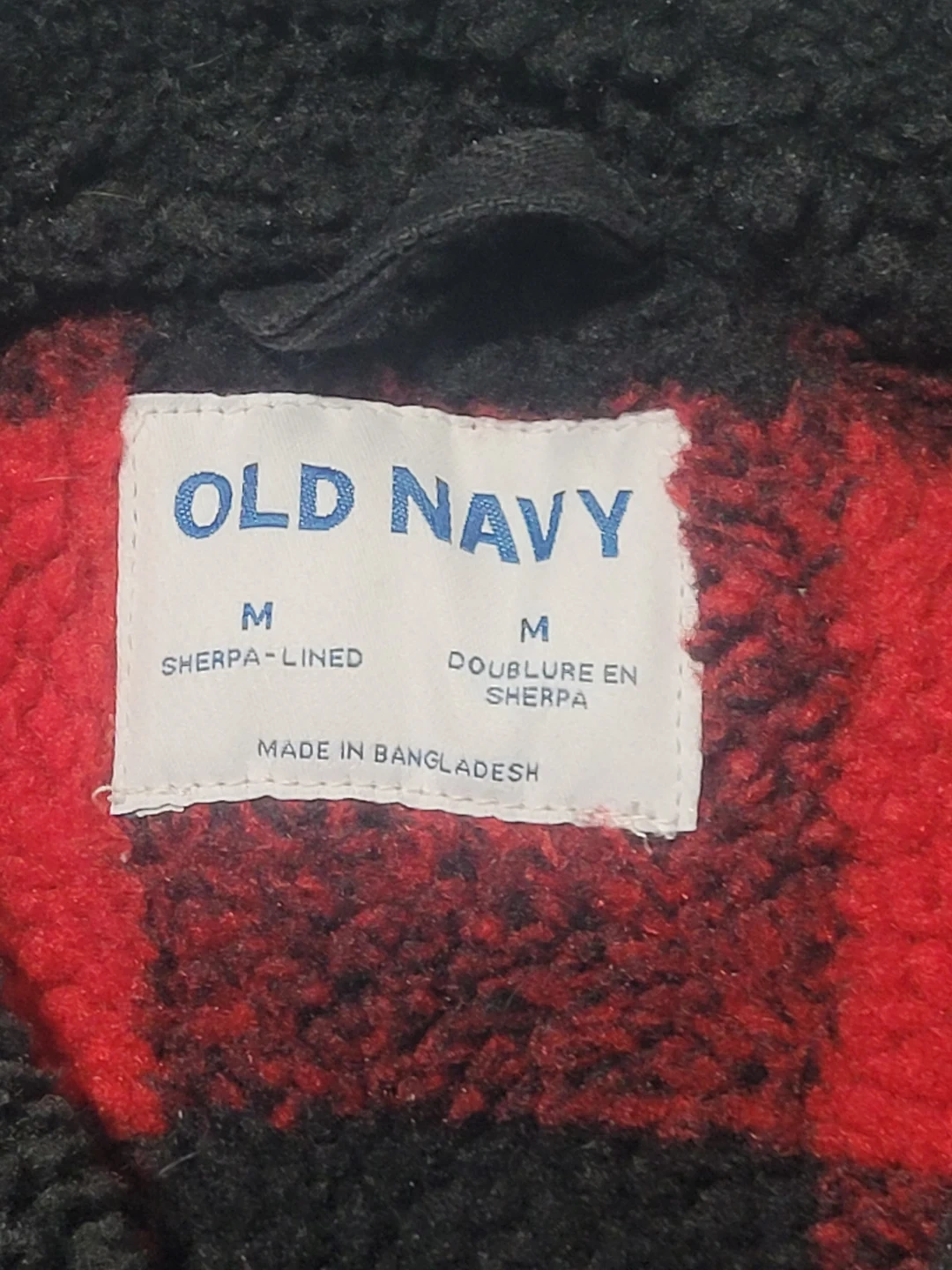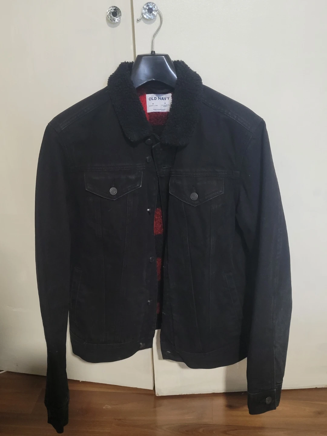 This is an Old Navy sherpa-lined denim jacket. It's a size medium with a black denim exterior and a red and black buffalo plaid lining. It features a faux shearling collar. Very good condition.