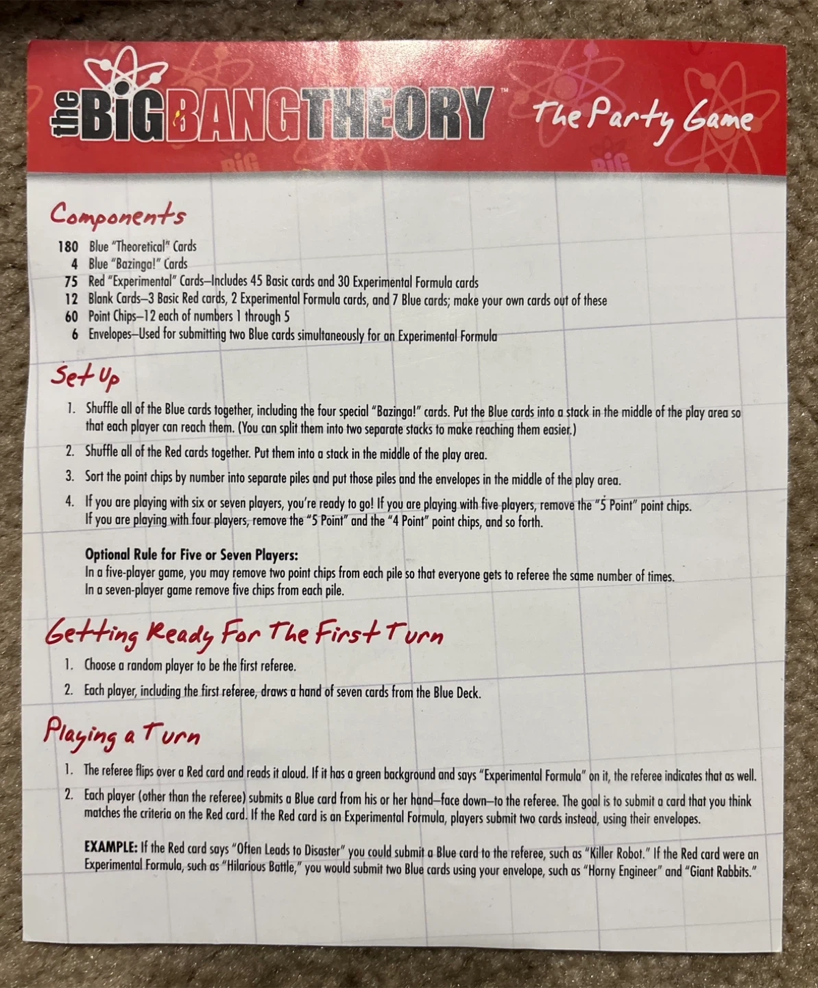 Selling The Big Bang Theory Party Game! It includes 180 Blue "Theoretical" Cards, 4 Blue "Bazinga!" Cards, 75 Red "Experimental" Cards, 12 Blank Cards, 60 Point Chips, and 6 Envelopes. Perfect for ages 15 and up and 3-7 players
