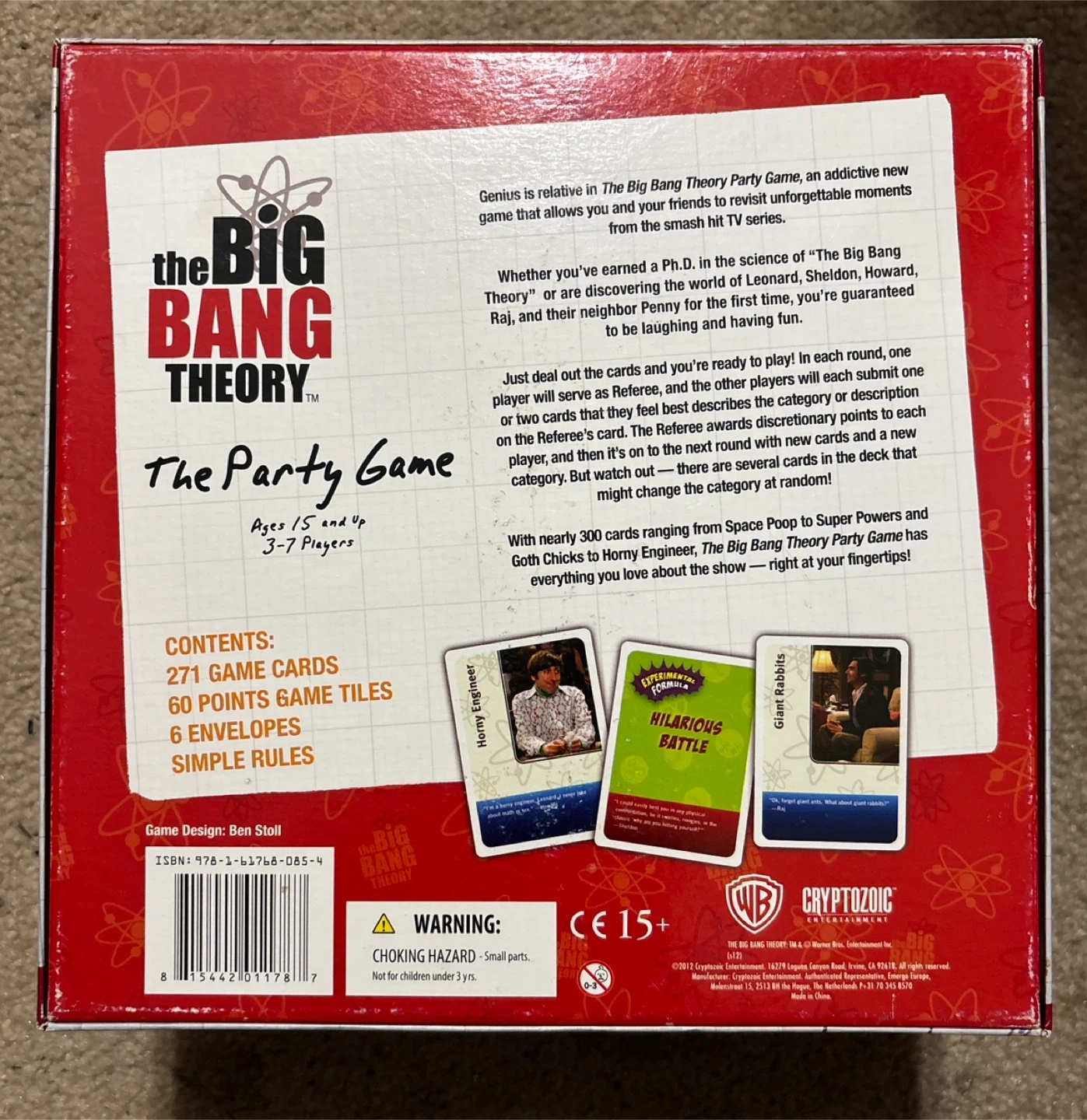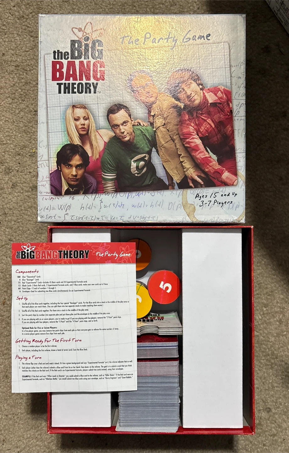 Selling The Big Bang Theory Party Game! It includes 180 Blue "Theoretical" Cards, 4 Blue "Bazinga!" Cards, 75 Red "Experimental" Cards, 12 Blank Cards, 60 Point Chips, and 6 Envelopes. Perfect for ages 15 and up and 3-7 players
