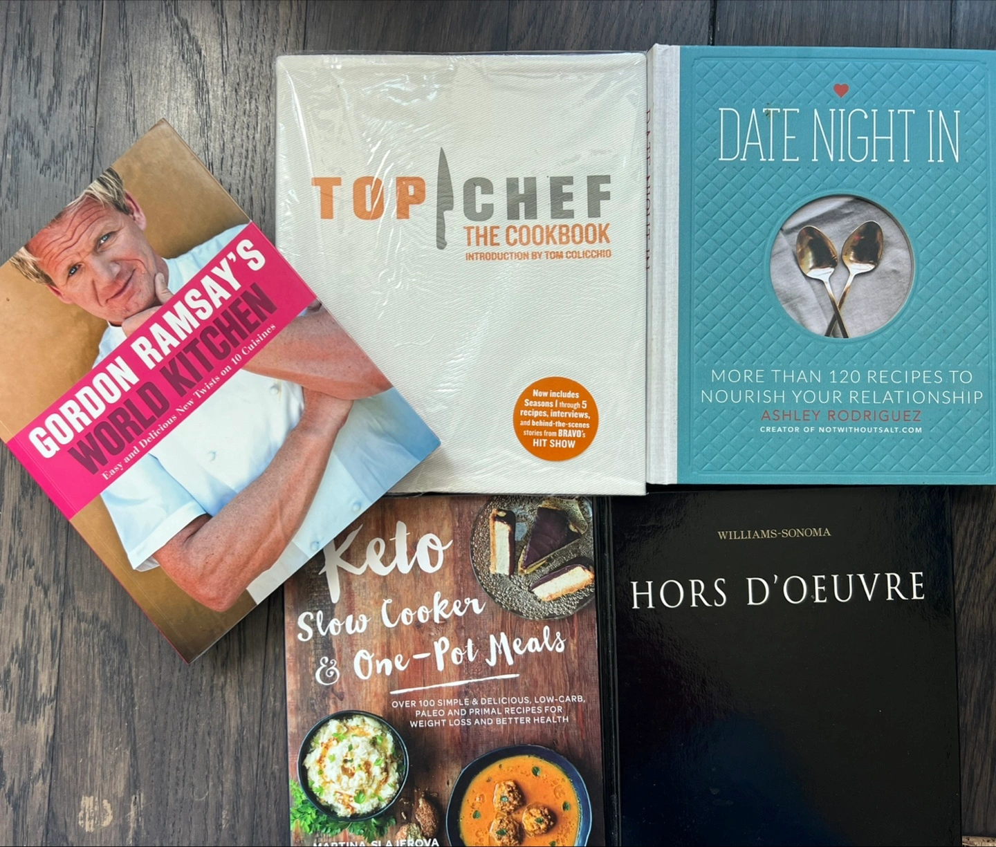 Bundle of five cookbooks including Gordon Ramsay's World Kitchen, Top Chef The Cookbook, Keto Slow Cooker & One-Pot Meals, Date Night In, and Williams-Sonoma Hors D'oeuvre. These cookbooks offer a variety of recipes from international cuisine to specialized diets and entertaining.