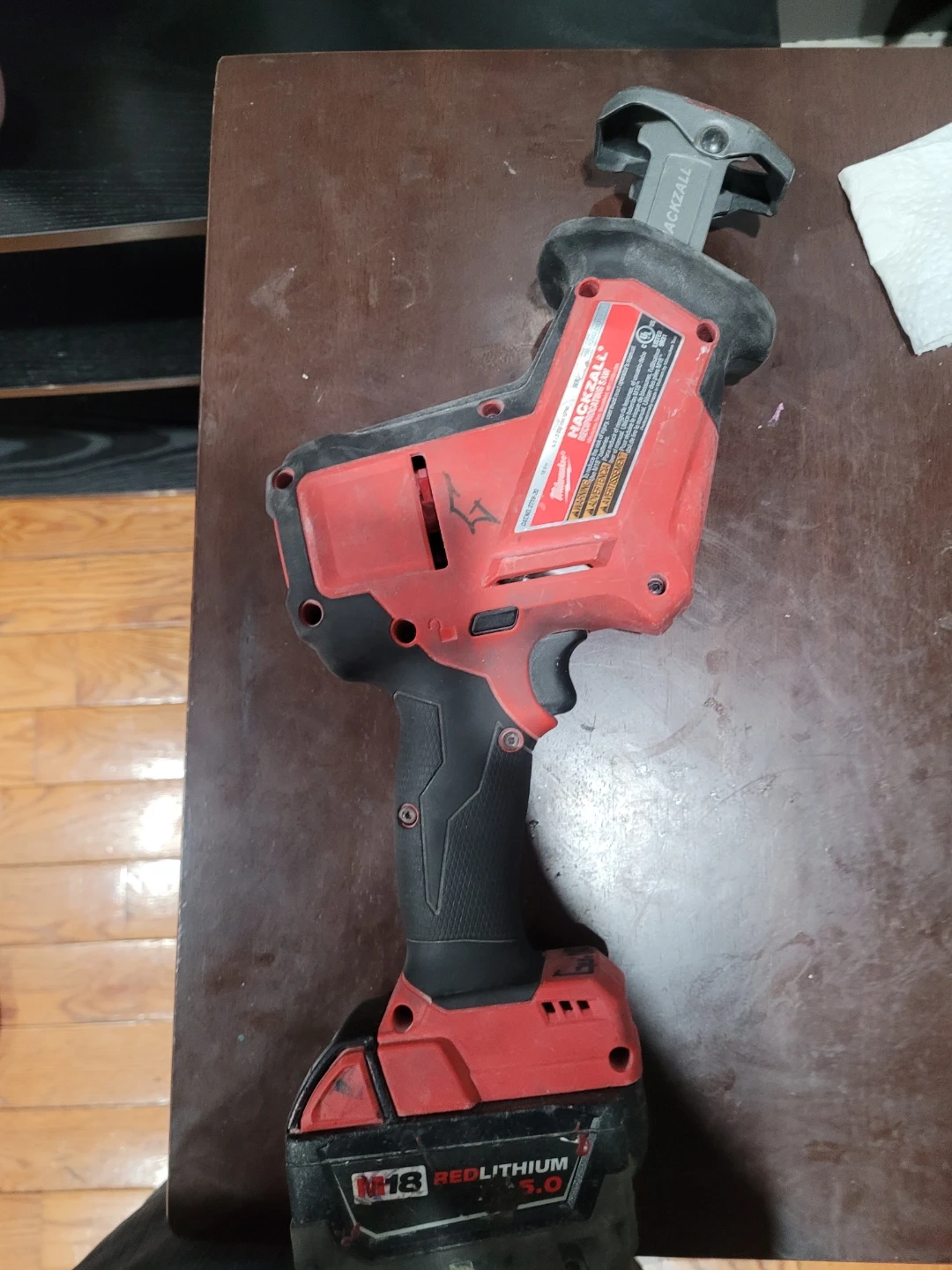 This is a Milwaukee M18 FUEL Sawzall reciprocating saw. It includes a Milwaukee M18 REDLITHIUM XC5.0 battery. This saw is designed for tough cutting jobs.