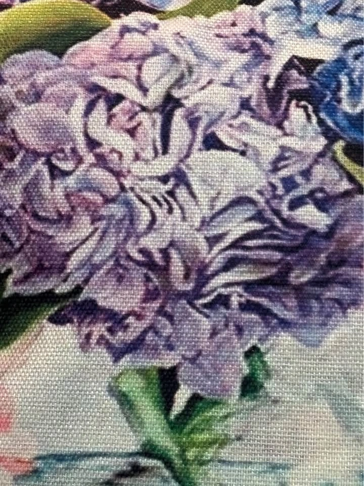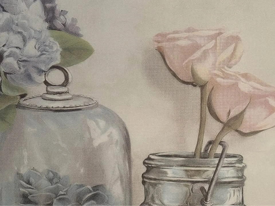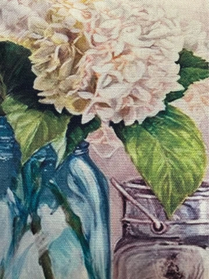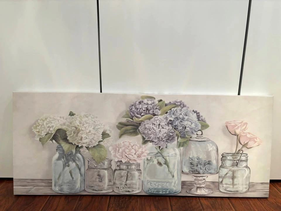 Very lovely wide soft and colourful peonies in glass vases and jars canvas art. 55" wide x 23" high. Well made and strong. Includes 2 matching 20” cushion covers - $15 (inserts not included). From a smoke and pet free home. Pick up in Keswick.