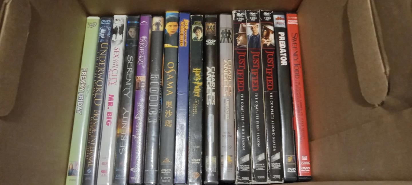 This is a collection of assorted DVDs including movies and TV series. Some titles visible are 'Sweeney Todd', 'The Tudors', 'Harry Potter', and 'Justified'. Most discs appear to be in their original cases.