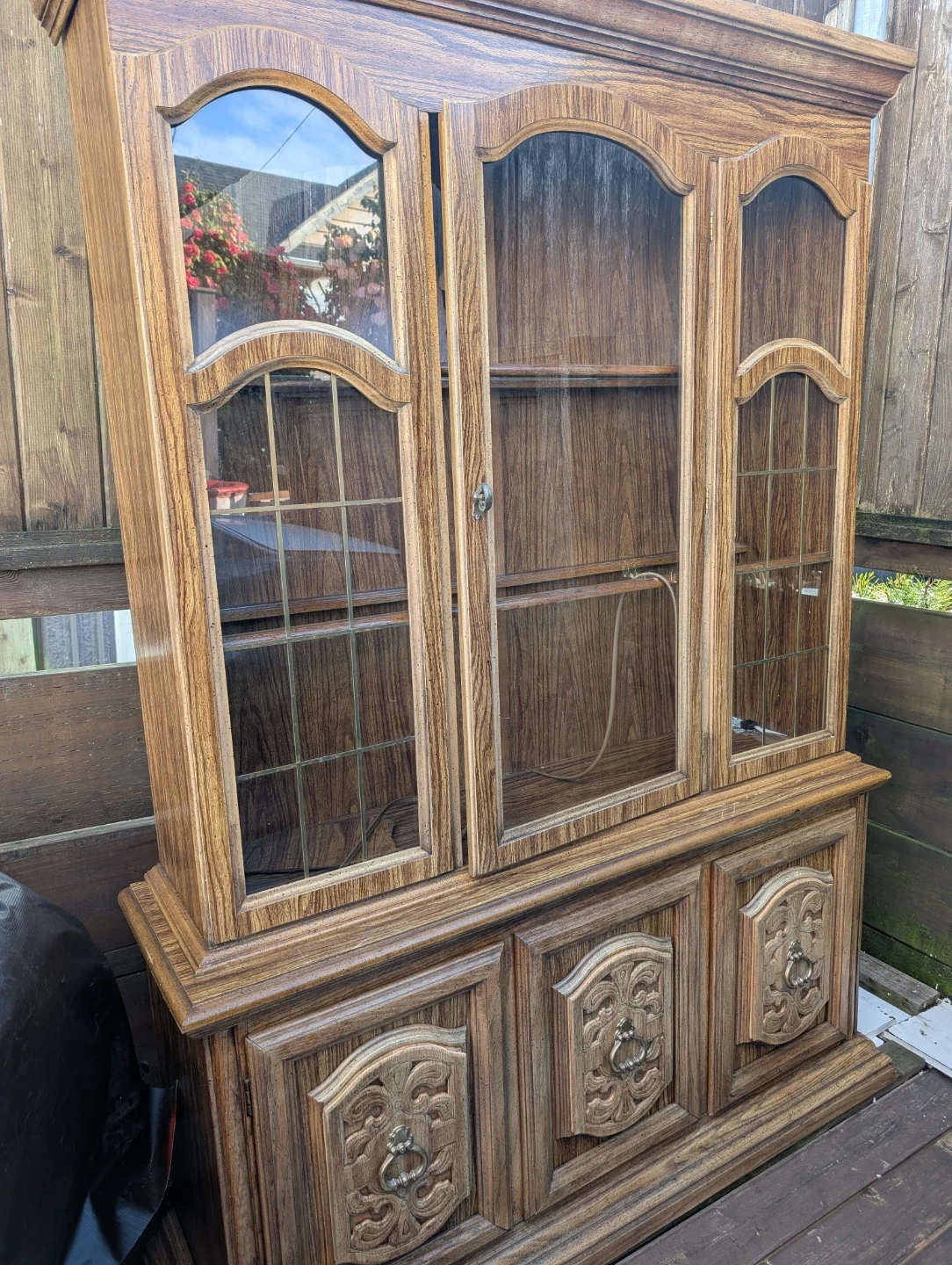 This wooden china cabinet features glass doors with decorative detailing. It has a classic design with ample shelf space for displaying dishes or collectibles. The lower section has three cabinets with ornate pulls.