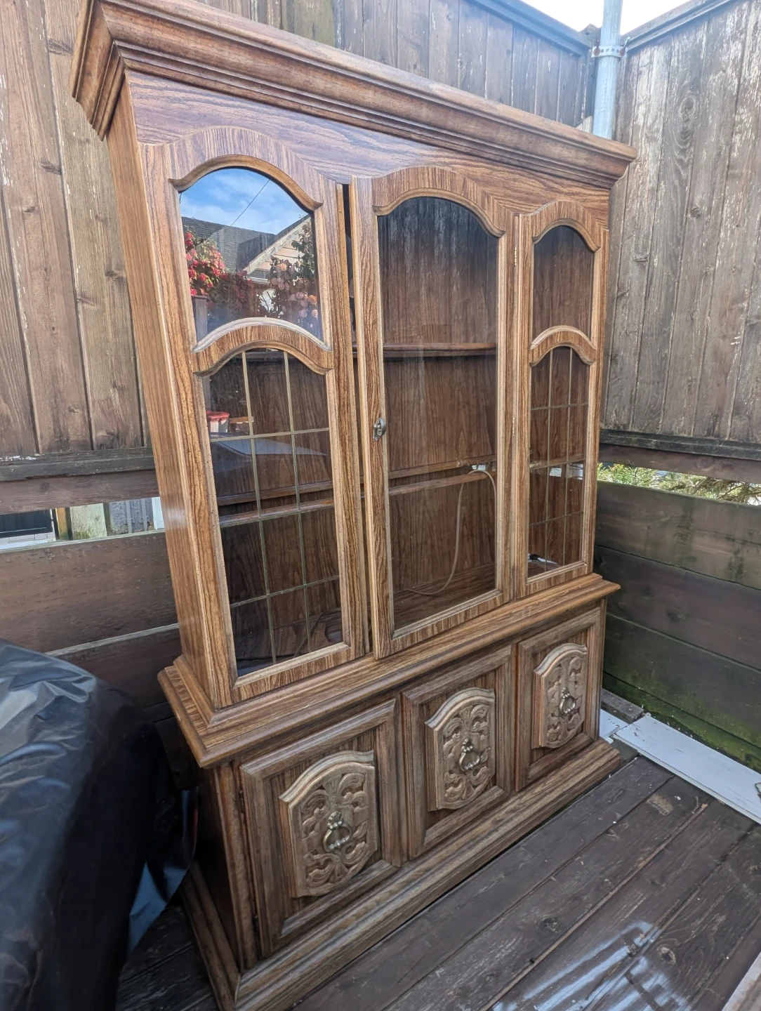 This wooden china cabinet features glass doors with decorative detailing. It has a classic design with ample shelf space for displaying dishes or collectibles. The lower section has three cabinets with ornate pulls.