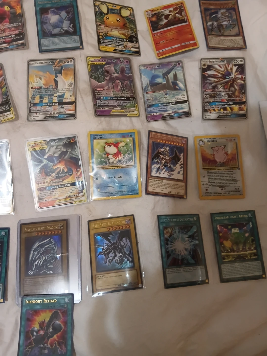 Collection of various Pokemon and Yu-Gi-Oh! trading cards, including several GX and EX versions. Cards feature distinct artwork and stats for gameplay or collecting. Great for fans and collectors of all ages!
