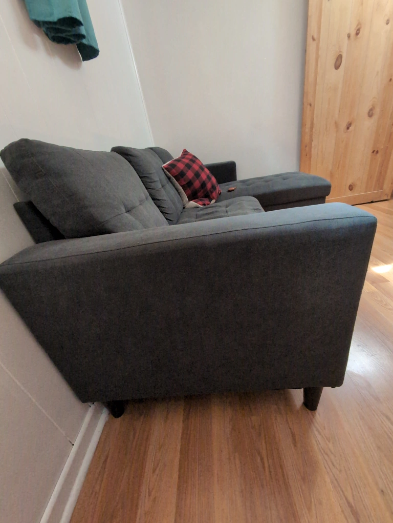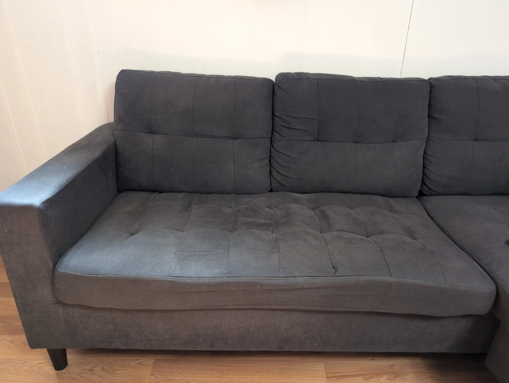 Selling a dark grey sectional sofa. It's in good condition and ready for a new home! It features a button-tufted design on the cushions and a modern, minimalist style. Perfect for a living room or entertainment area.