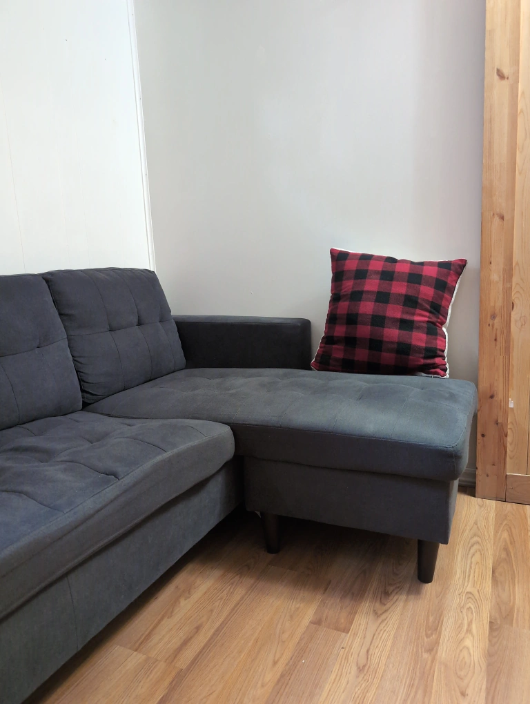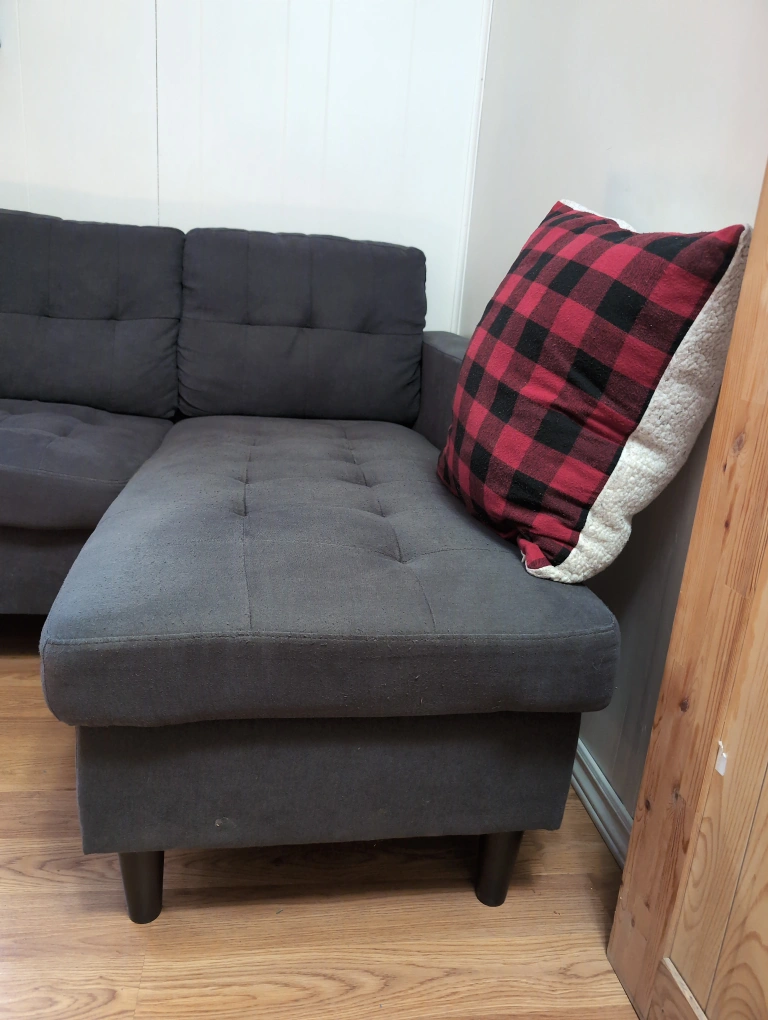 Selling a dark grey sectional sofa. It's in good condition and ready for a new home! It features a button-tufted design on the cushions and a modern, minimalist style. Perfect for a living room or entertainment area.