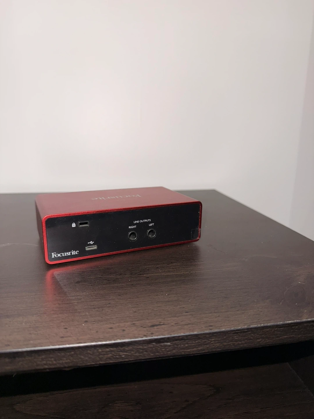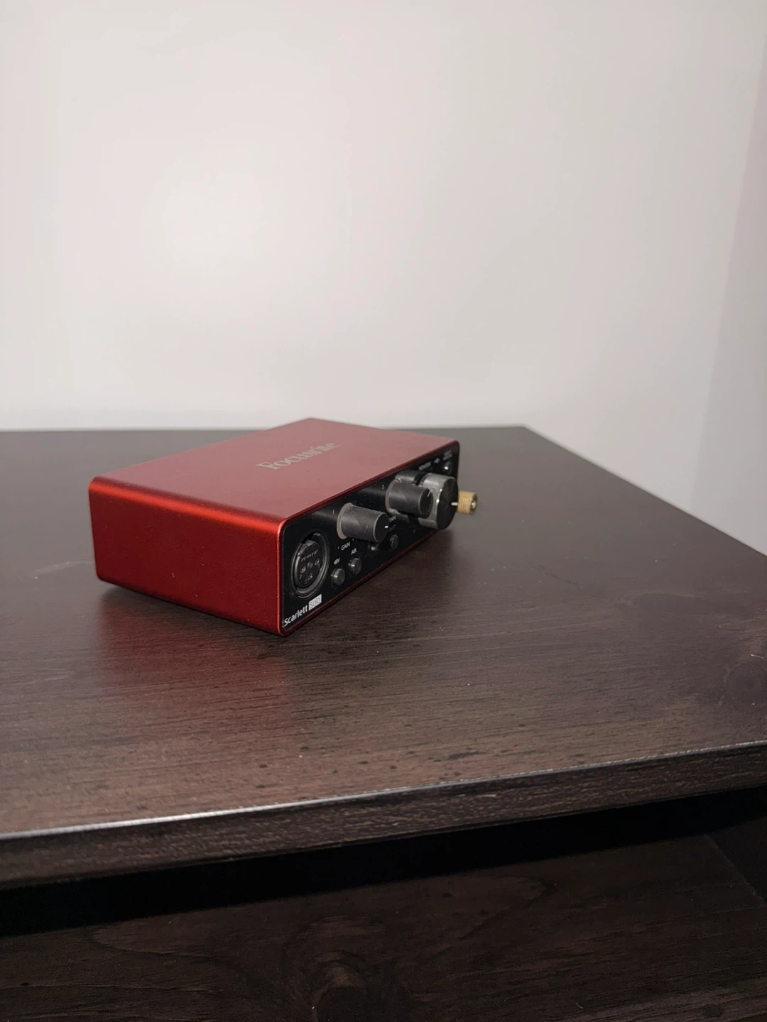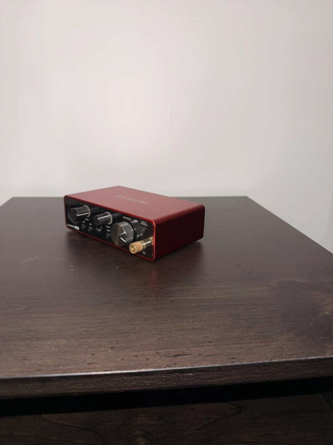 This is a red Focusrite Scarlett 2i2 USB audio interface. It has inputs for microphones and line-level instruments. Outputs include monitor and headphone jacks.