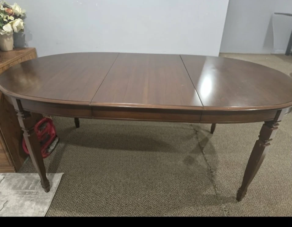 A dark wood extendable dining table. It has a classic design with turned legs. This table can be extended to accommodate more guests. Its very new i barley even used it got it for 500