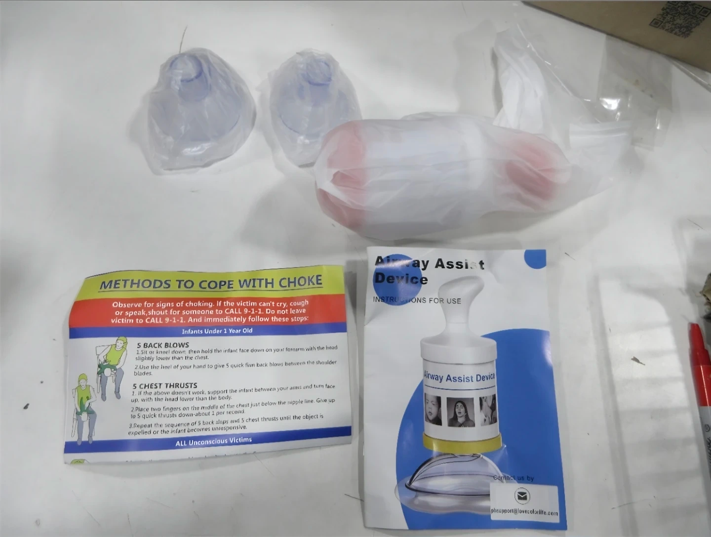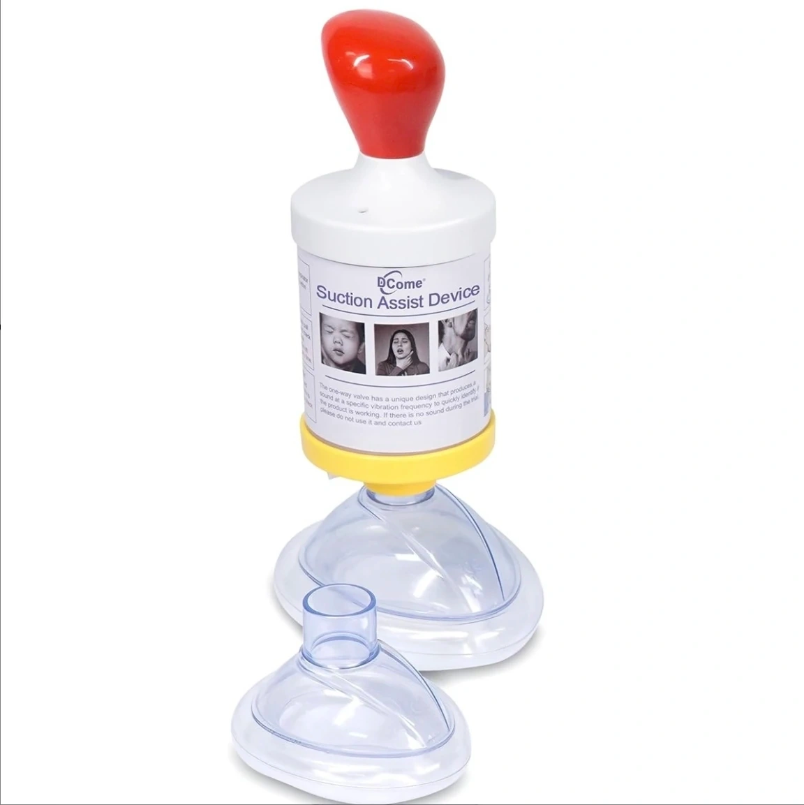 This is a D-Come Suction Assist Device for airway clearance. It's designed for easy use and to effectively suck out obstructions. It comes with an adult mask and an infant mask.