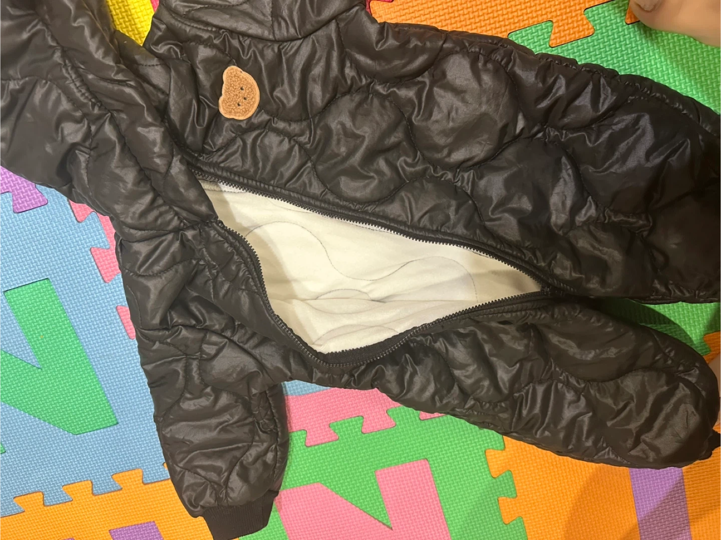Warm black puffer snowsuit with a quilted heart pattern. It has a full zipper front and a cozy fleece-lined hood. Features a cute teddy bear patch on the chest.