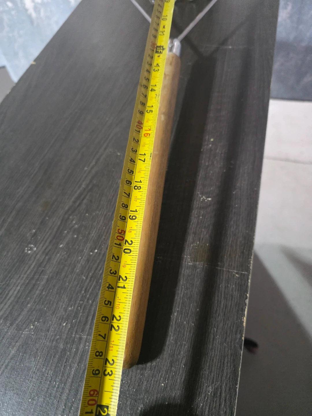 This jumbo size potato masher is made with a sturdy stainless steel mashing head and a comfortable wooden handle. It's designed for efficient mashing of potatoes and other soft foods. The handle measures about 5 inches long, and the mashing head is approximately 4 inches wide.