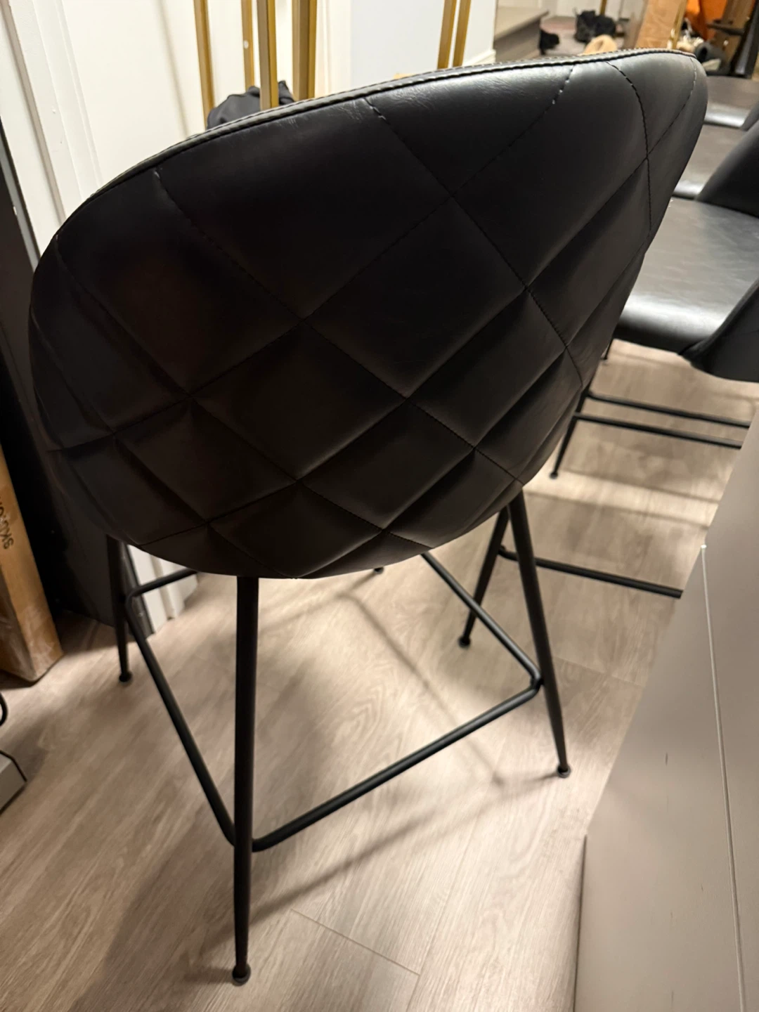Selling a set of four stylish bar stools. They feature a sleek black seat with a quilted design on the back. The stools have a sturdy black metal frame and are in great condition, perfect for adding a modern touch to your kitchen or bar area!