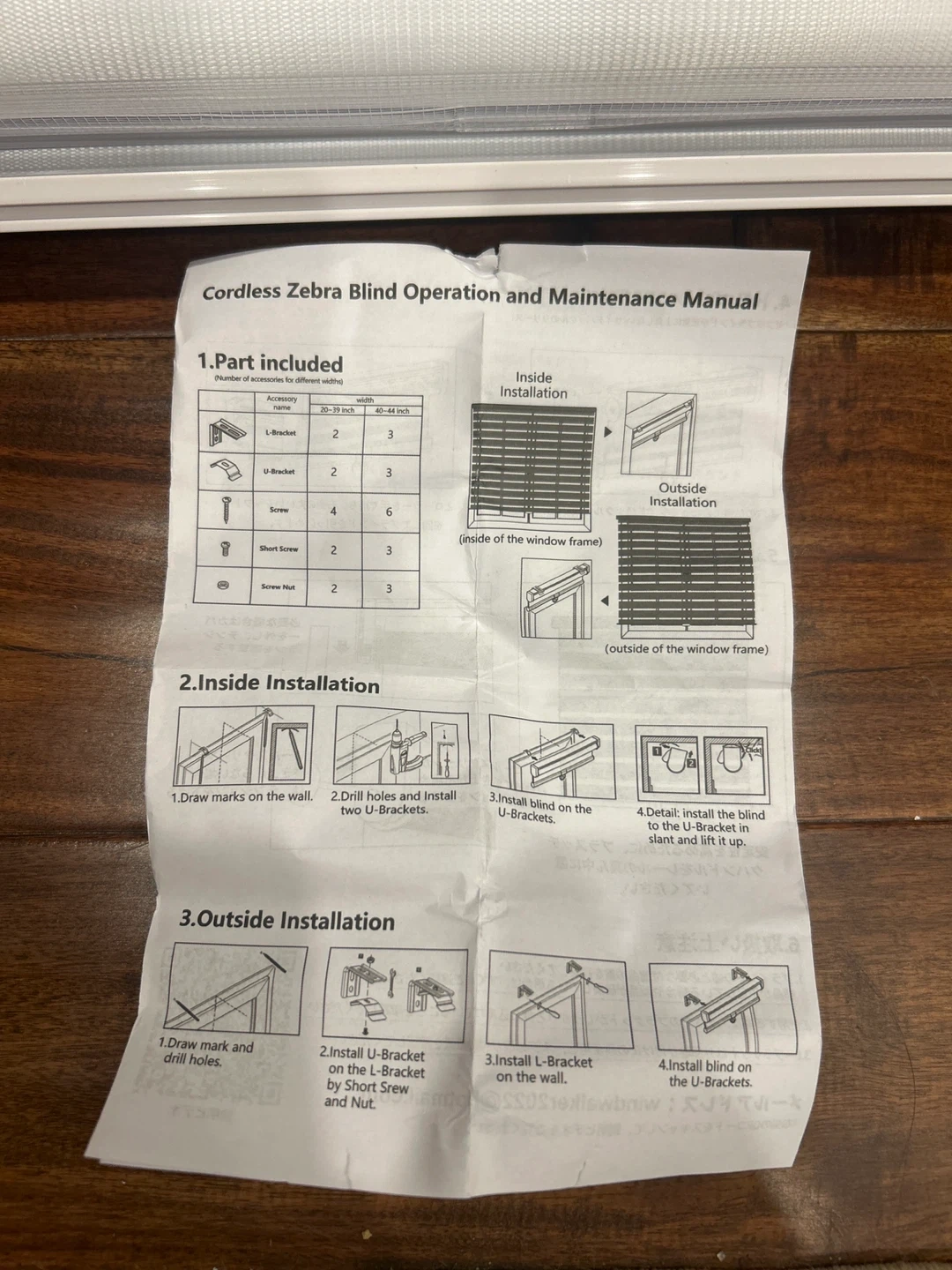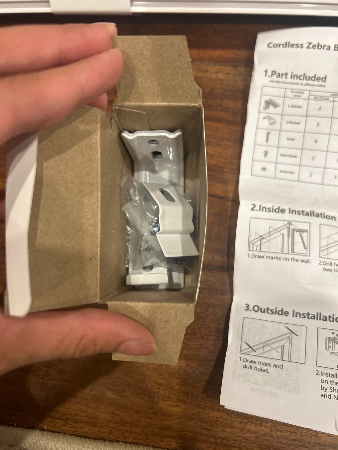 Selling a brand new cordless zebra blind! It comes with all the original parts included, such as L-brackets, U-brackets, screws, short screws, and screw nuts. The included manual shows how to install the blind inside or outside of a window frame. Perfect for adding some privacy and style to your home