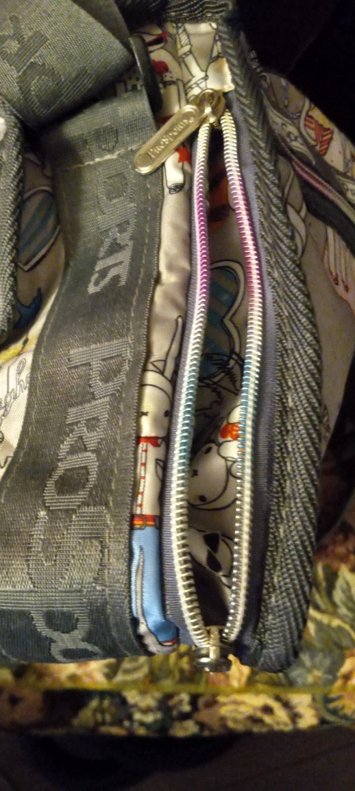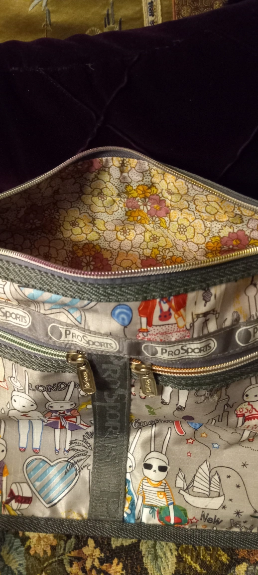 This is a multi pocketed PROSPORT, lightweight carry all crossbody bag. It has love bunnies traveling the globe holding hands and loving every minute of it. The zippered compartments are beautifully colourful and slide easily as does the wide adjustable shoulder strap. The London, Paris, New York, Hong Kong motifs are splashed along side the traveling couple. There is a zipper around the circumfrance to enlargen the bag when shopping. PS. The inside is oh so pretty too!♡