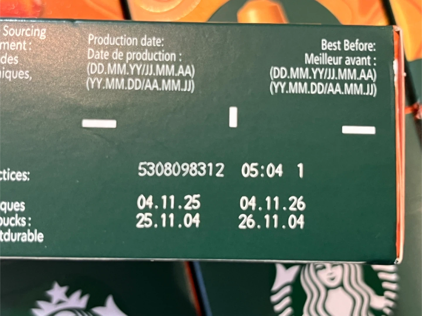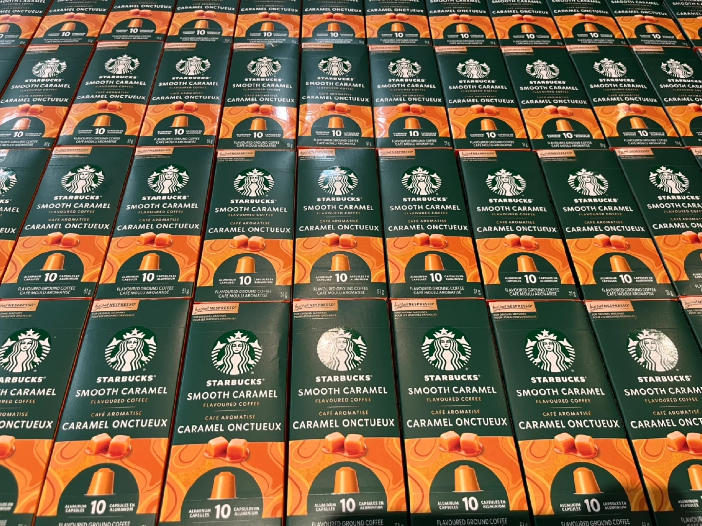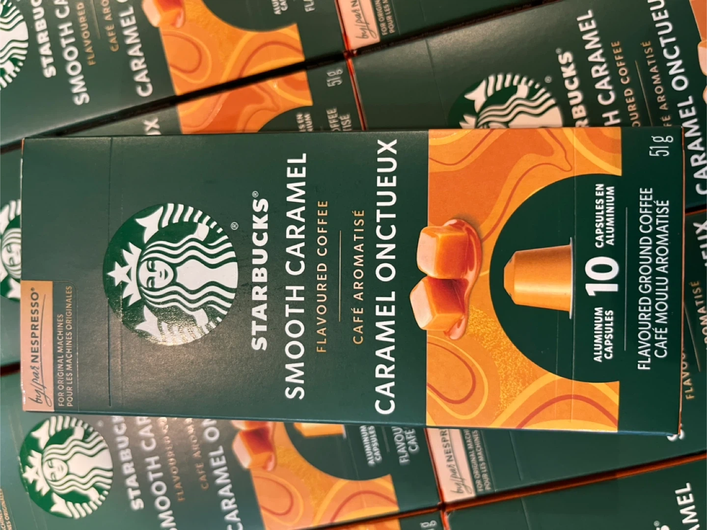 Starbucks Smooth Caramel flavoured ground coffee capsules for Nespresso machines. Includes 10 aluminum capsules, each weighing 5g. Best before November 26, 2024.