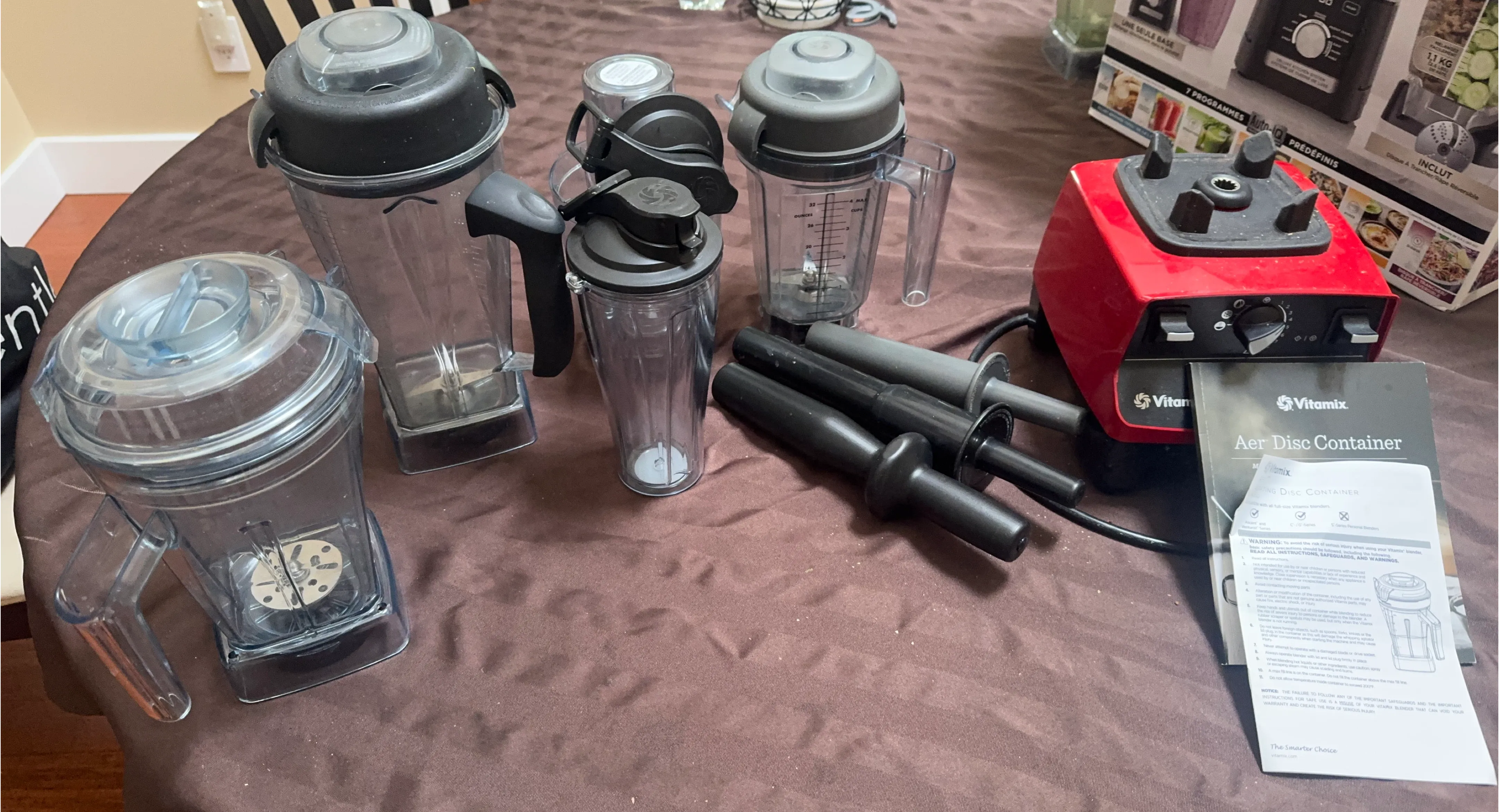 This Vitamix blender comes with various containers and three black and grey tampers. It features a red motor base and includes the Aer Disc Container with its instruction manual. It's a versatile blending system for your kitchen needs!