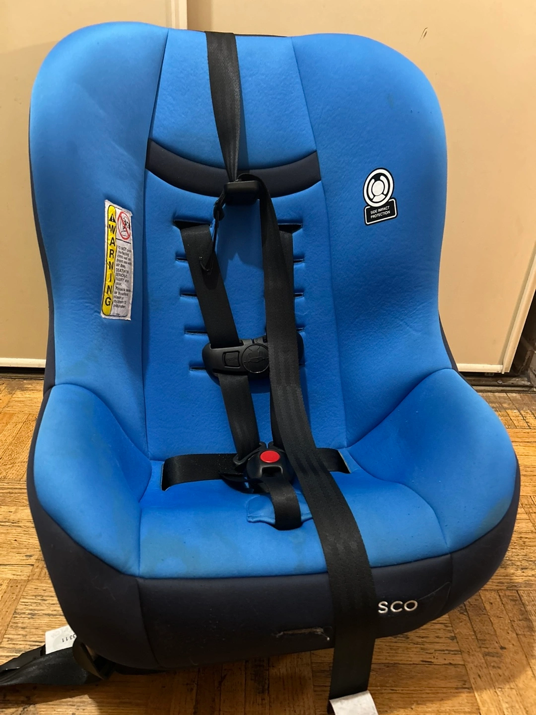 Selling a Cosco car seat in blue! It has a side impact protection feature and adjustable straps. It's in good condition and ready for a new home.
