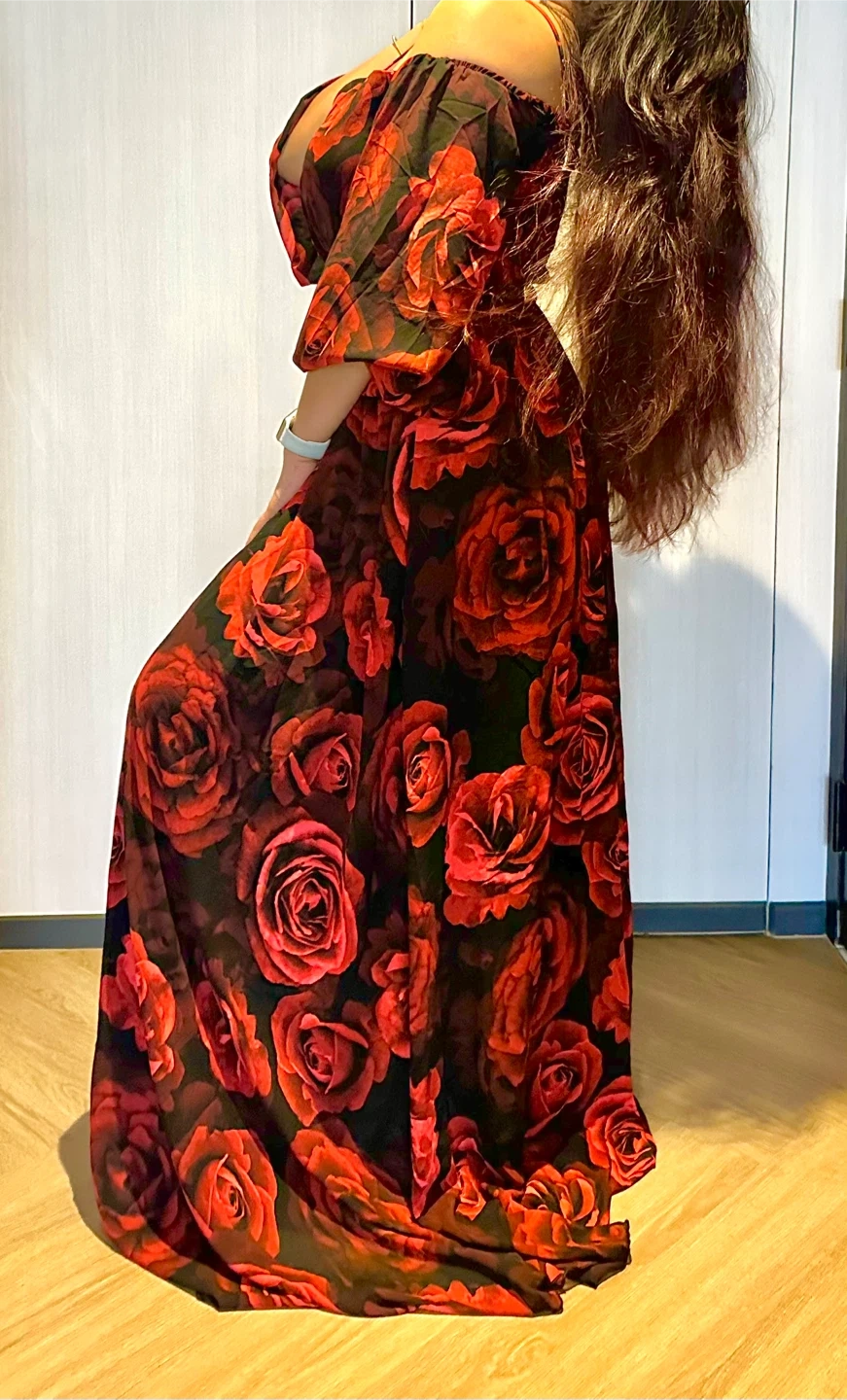 Gorgeous off-the-shoulder maxi dress featuring a bold red rose print on a black background. It's made from a lightweight, flowing fabric perfect for warmer weather or special occasions. The puff sleeves add a touch of dramatic flair!