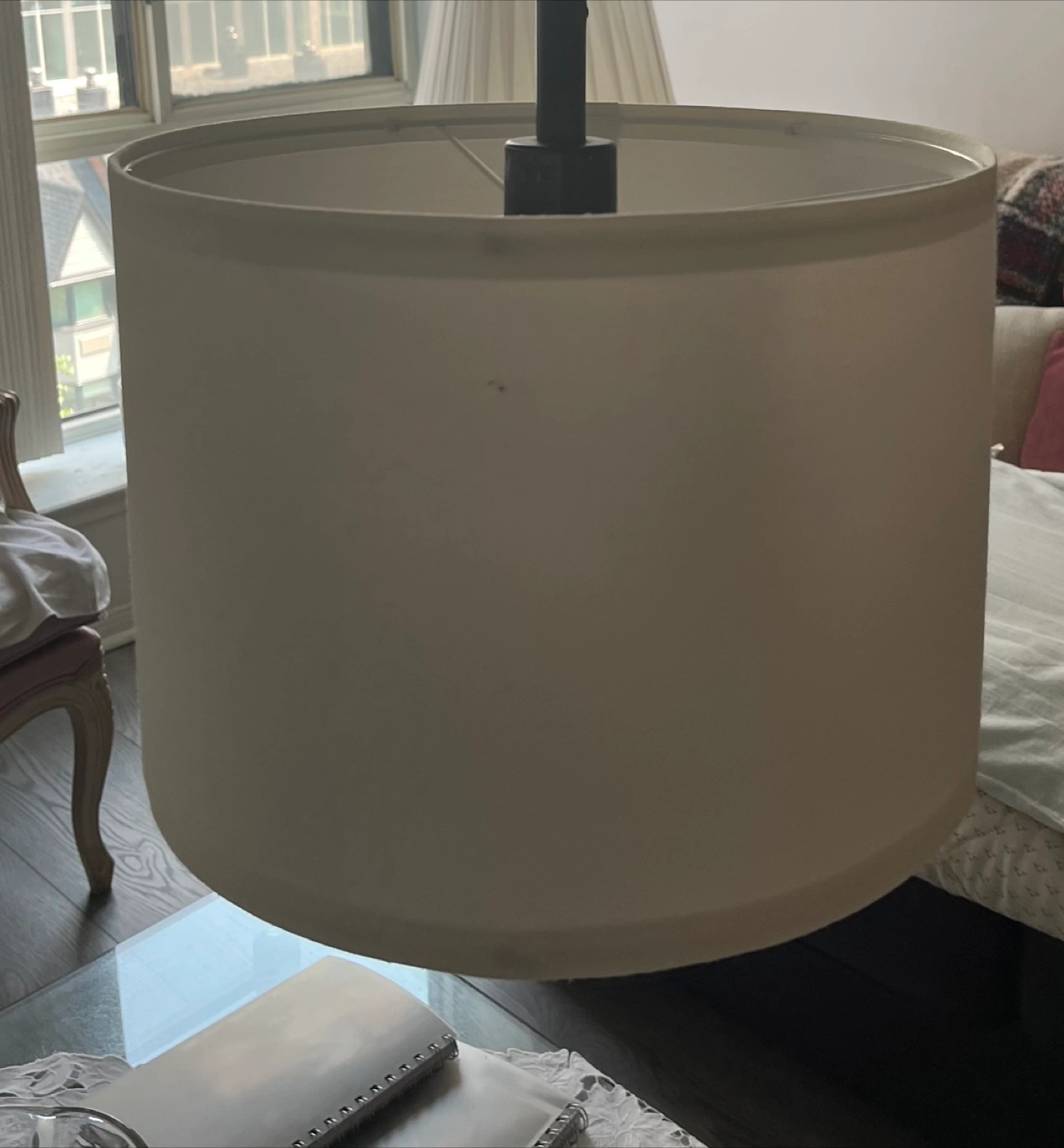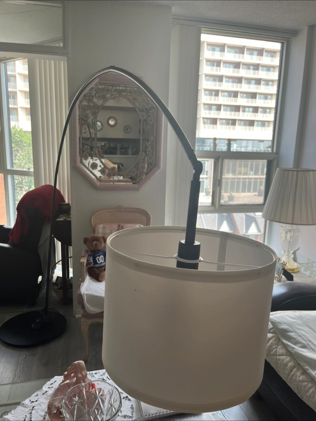 Selling a used arc floor lamp. It features a black arched stand and a white drum shade. A stylish addition to any living room or bedroom!
