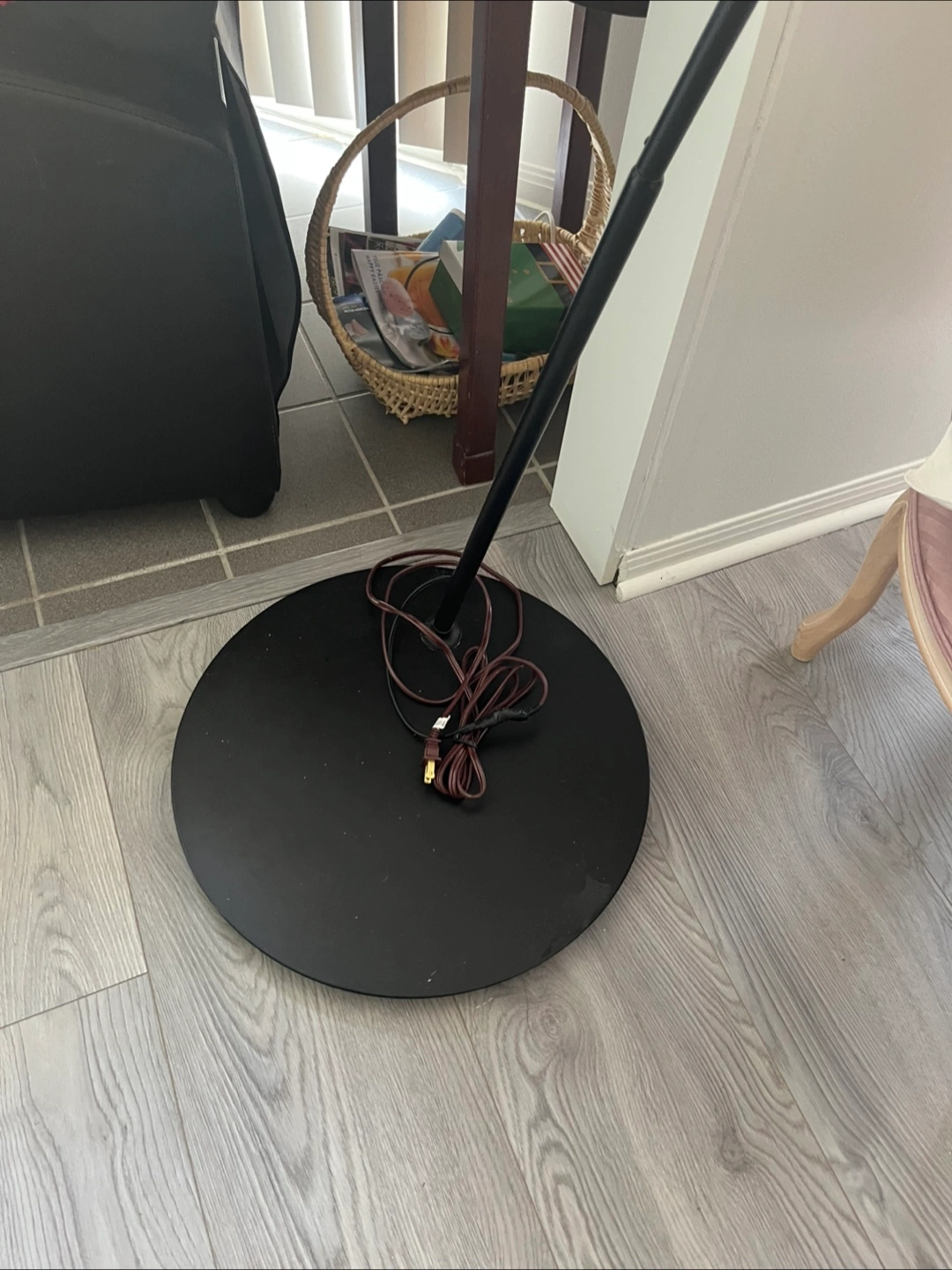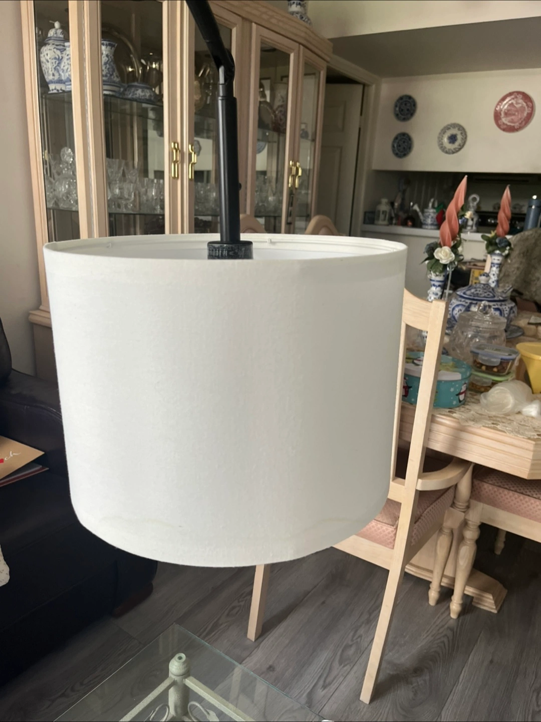 Selling a used arc floor lamp. It features a black arched stand and a white drum shade. A stylish addition to any living room or bedroom!