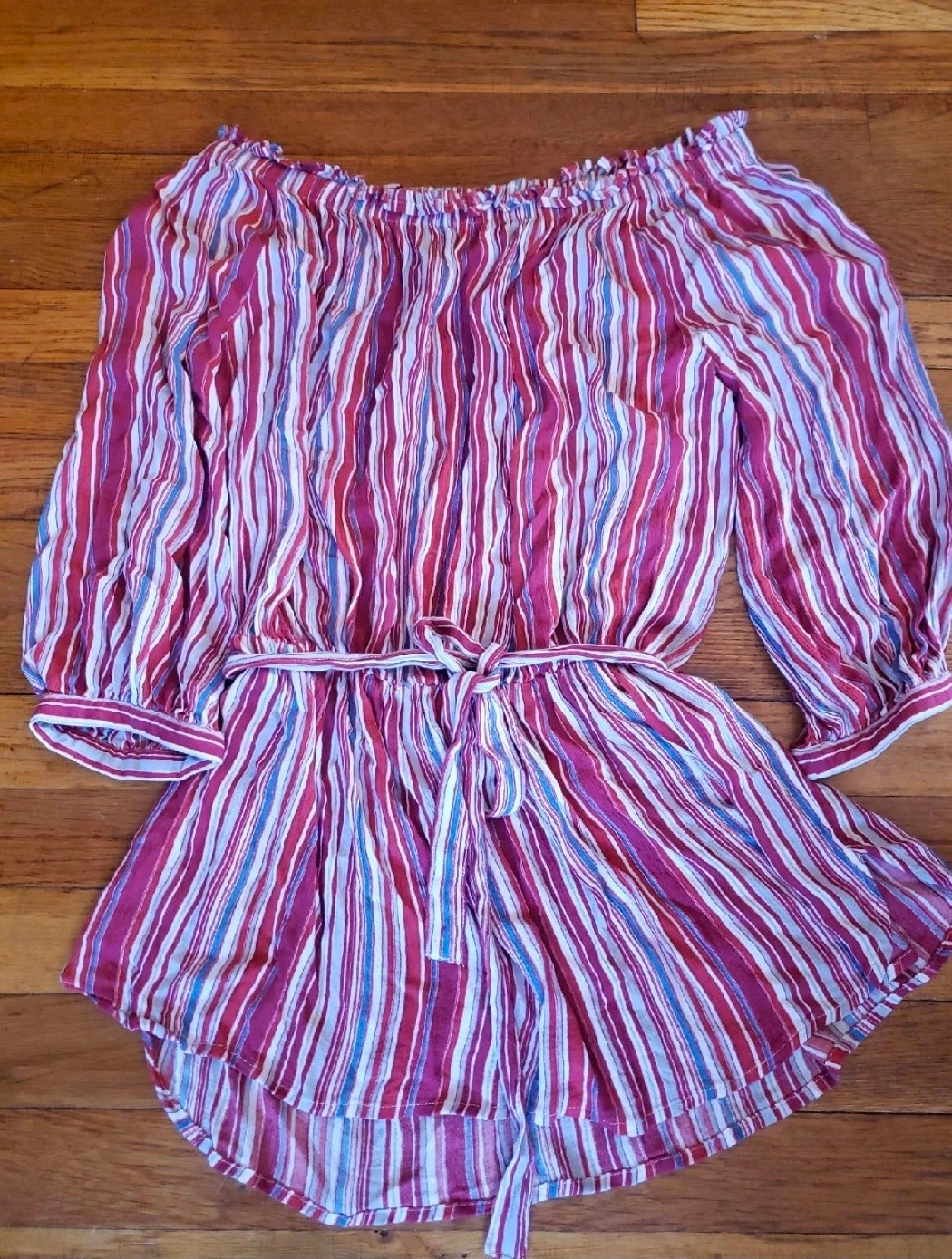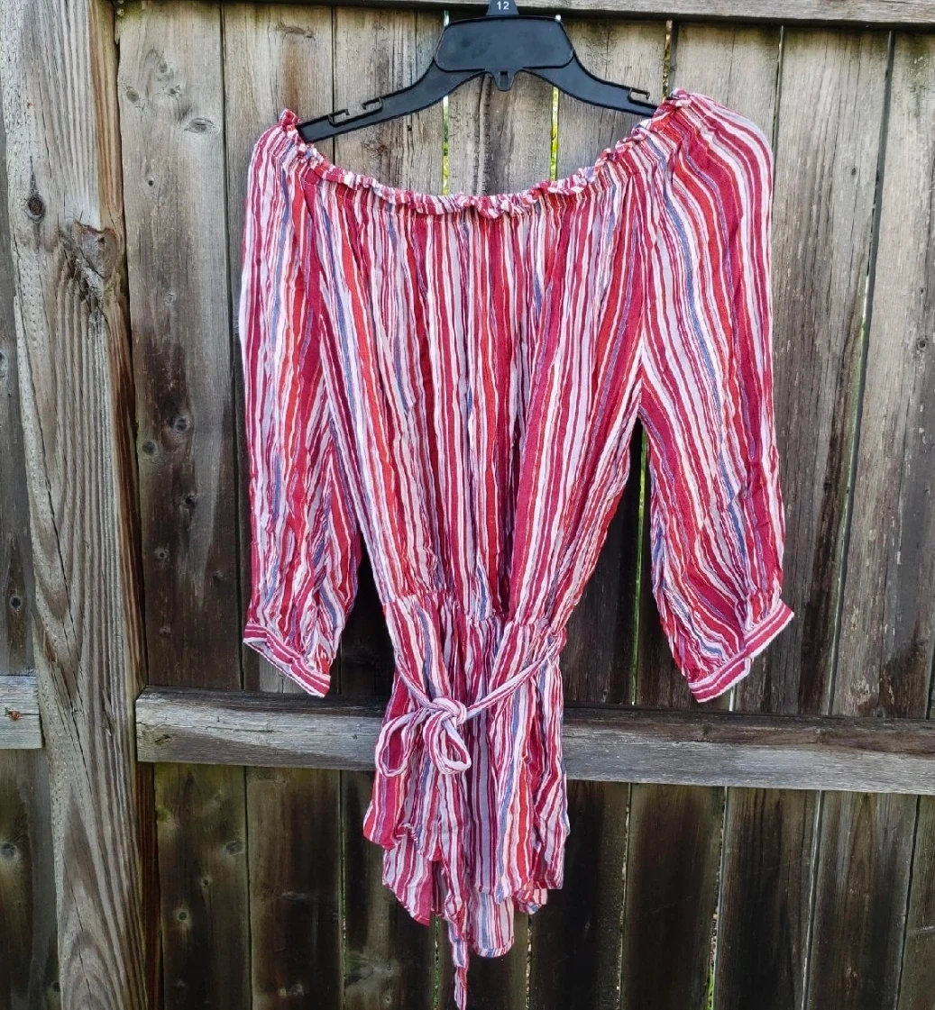 This is a cute striped blouse with an off-the-shoulder neckline. It features a tie waist and long sleeves. The colors are a mix of red, white, and blue. Perfect for a casual day out!