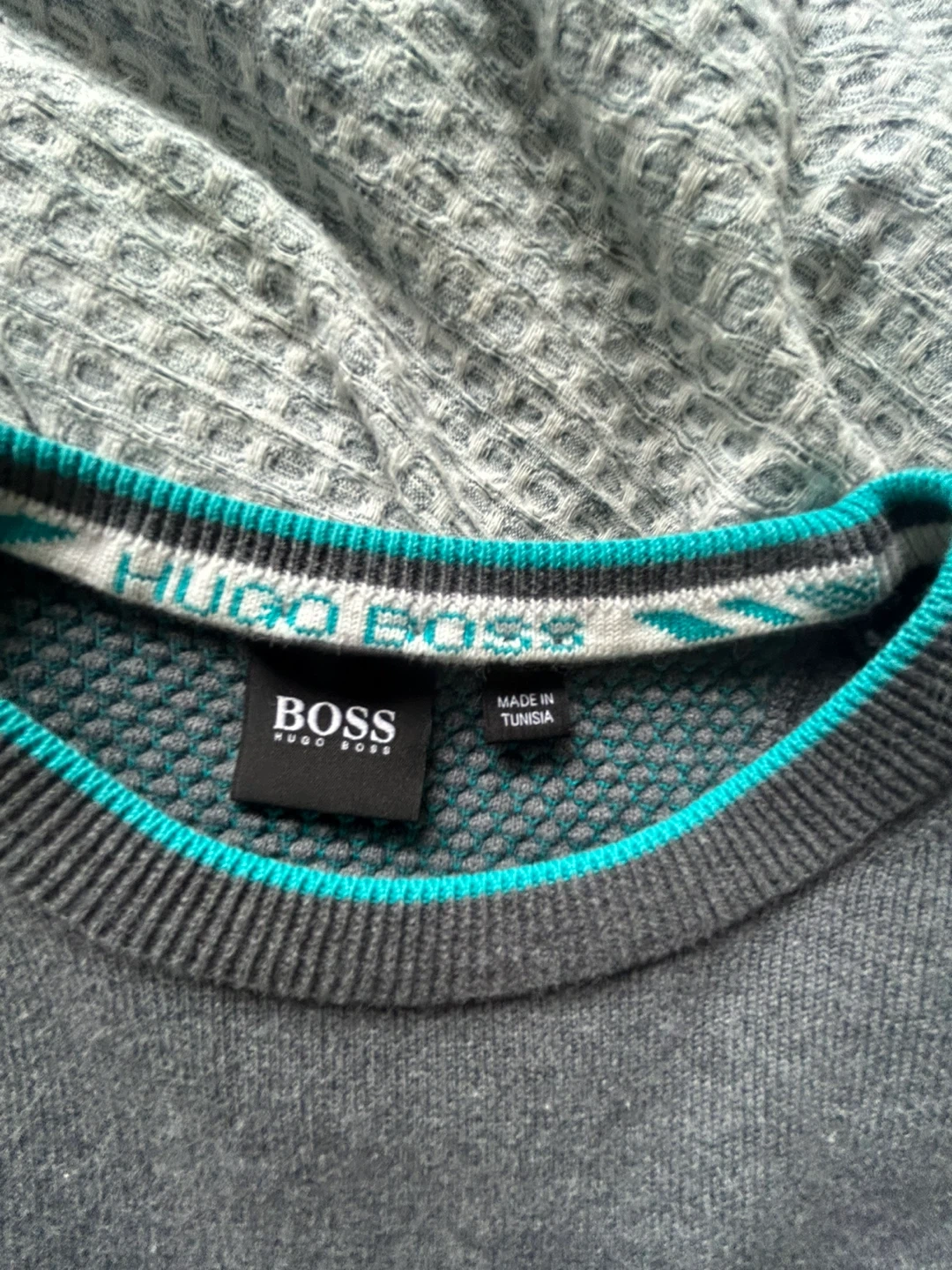 Grey Hugo Boss crewneck sweater. Features turquoise detailing on the collar and cuffs. Made in Tunisia. Perfect for a smart casual look!
